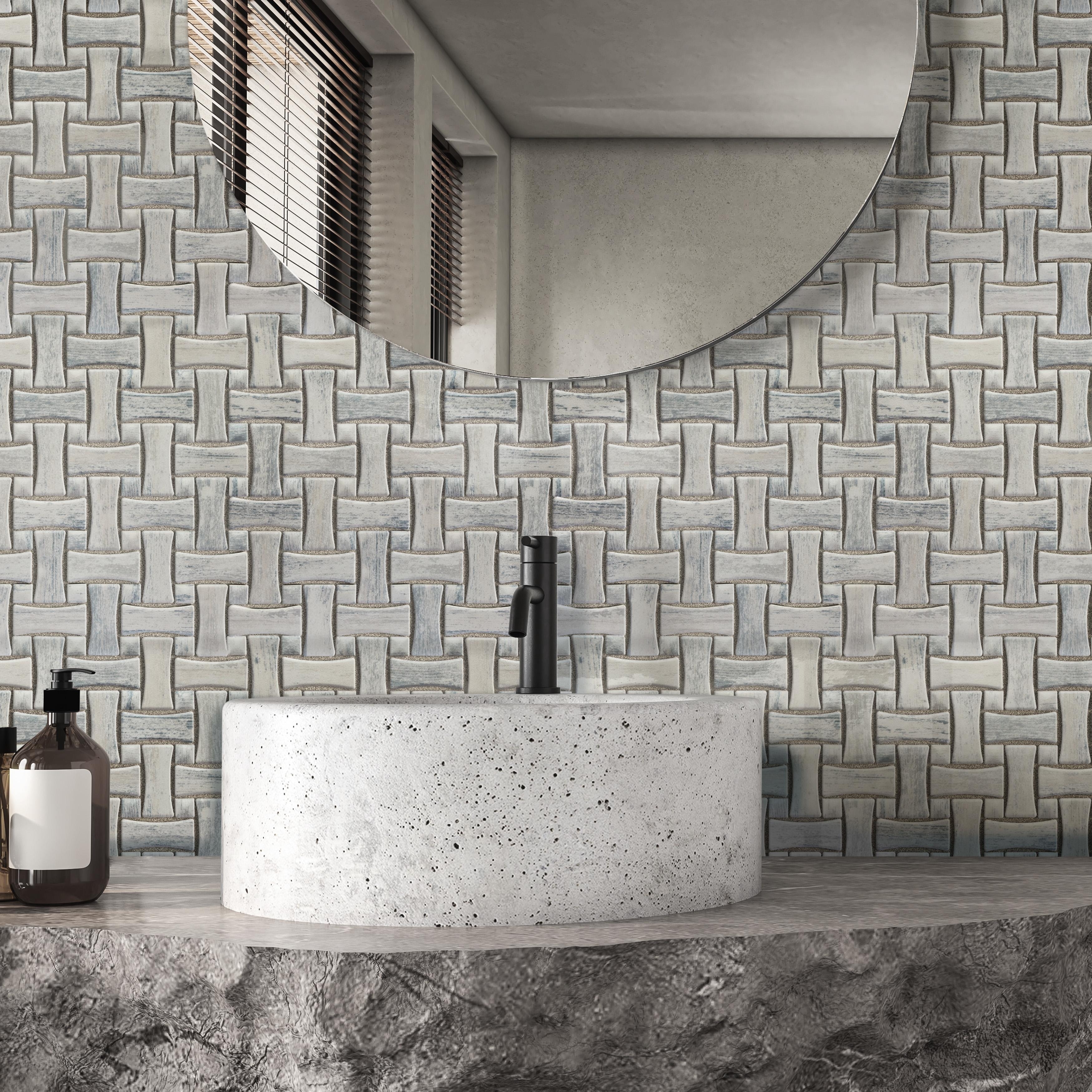 Offering a mosaic look, our Cassis Dog Bone Basketweave White with White Dot Porcelain Floor and Wall Tile features a smooth, satin finish, providing decorative appeal that adapts to a variety of stylistic contexts.