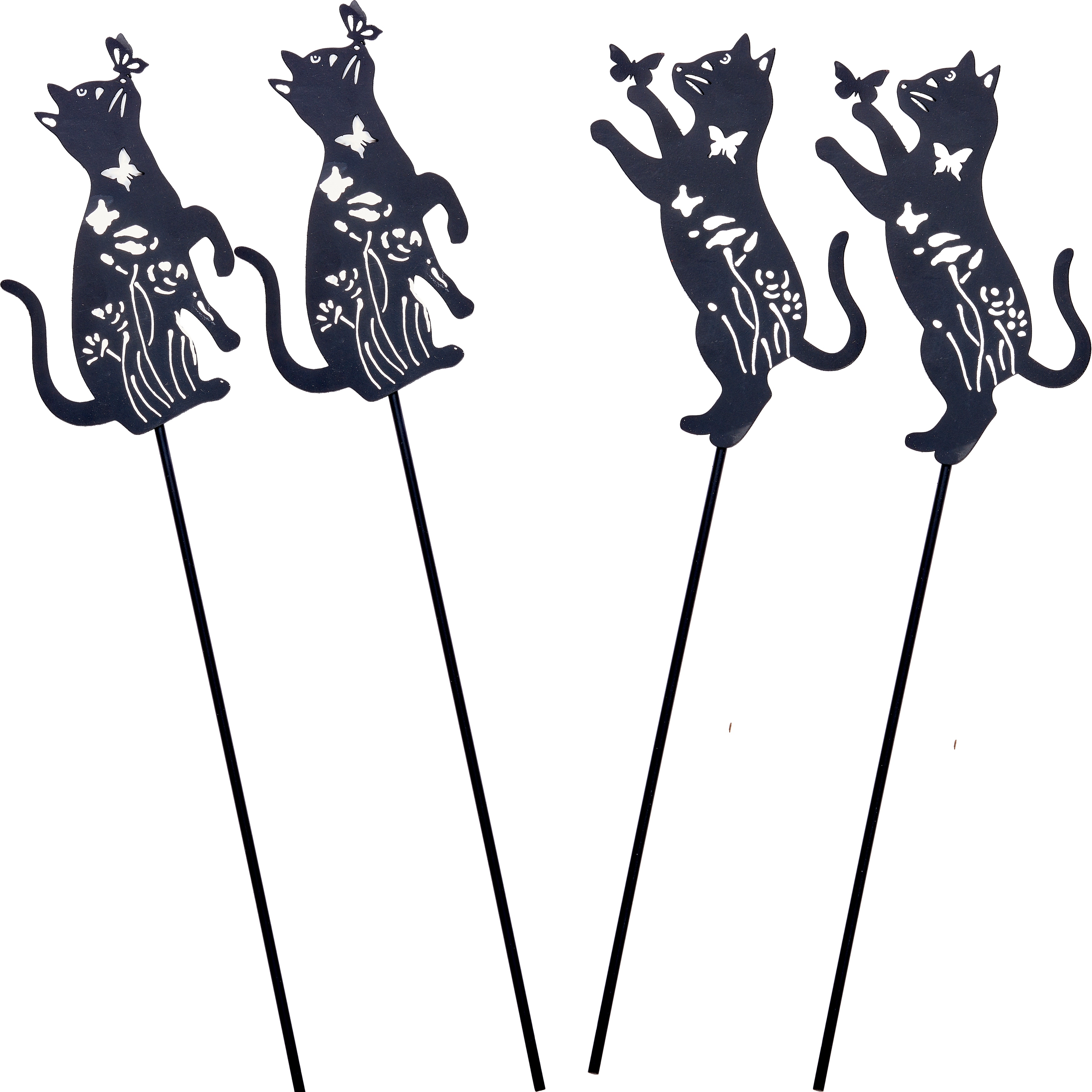 This 6" Iron Cat with Butterfly on an 11" Stake is perfect for adding charm to your pots and planters. Made of sturdy iron and painted with white design details, it's a great size for arrangements and decorative displays.