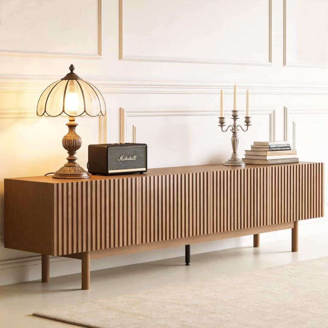🪵 Modern Slatted Design with Architectural Presence Designed to anchor modern living spaces, this 86.6-inch wood TV stand features a sculpted slatted front that delivers strong visual rhythm and architectural depth.