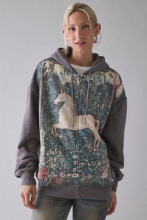 Uo Dusty Mystical Graphic Oversized Zip-Up Hoodie Sweatshirt - Gray - Urban Outfitters Sweats