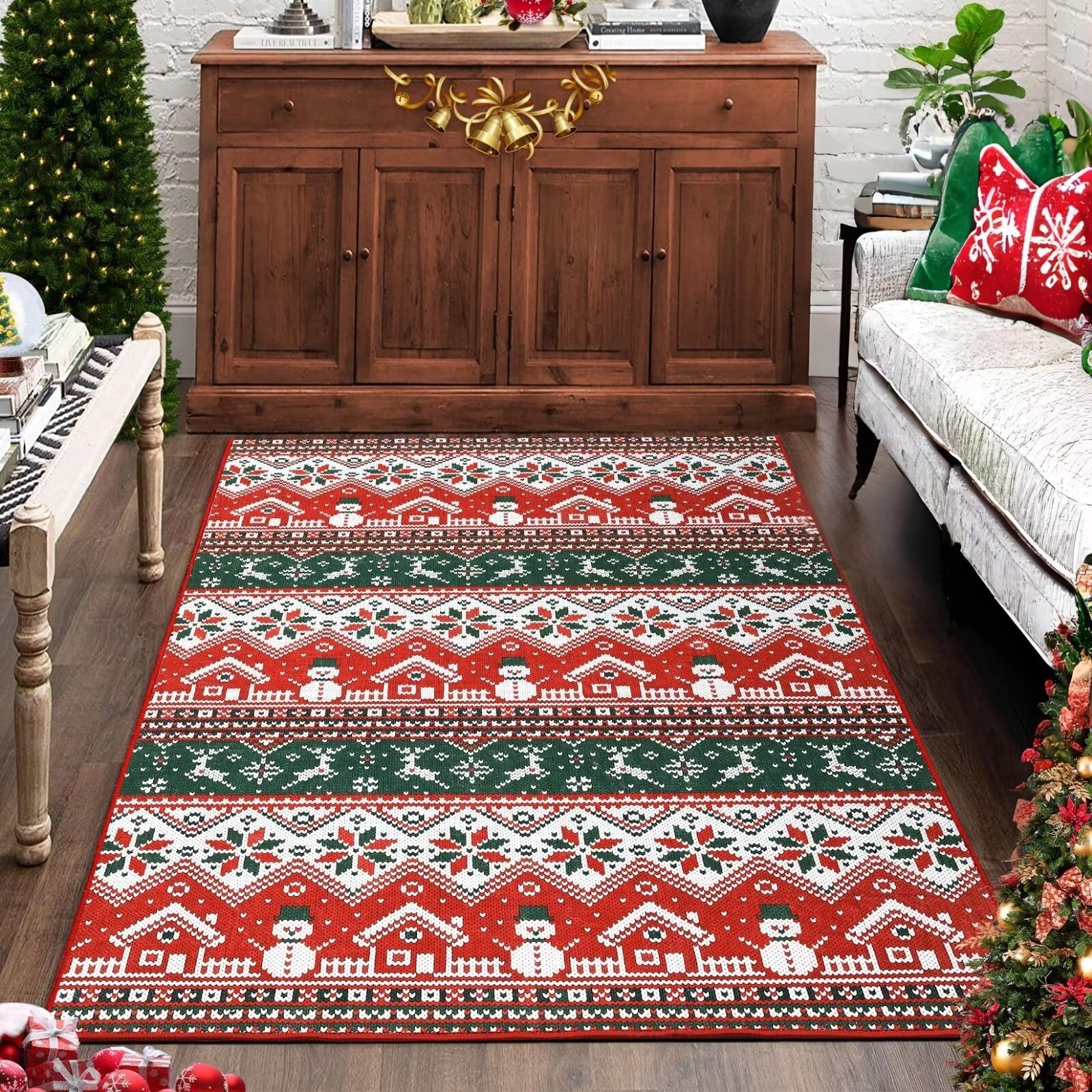 Christmas Area Rug Xmas Snowman Snowflakes Pattern Rug Washable Xmas Decorative Accent Rug, Red Green