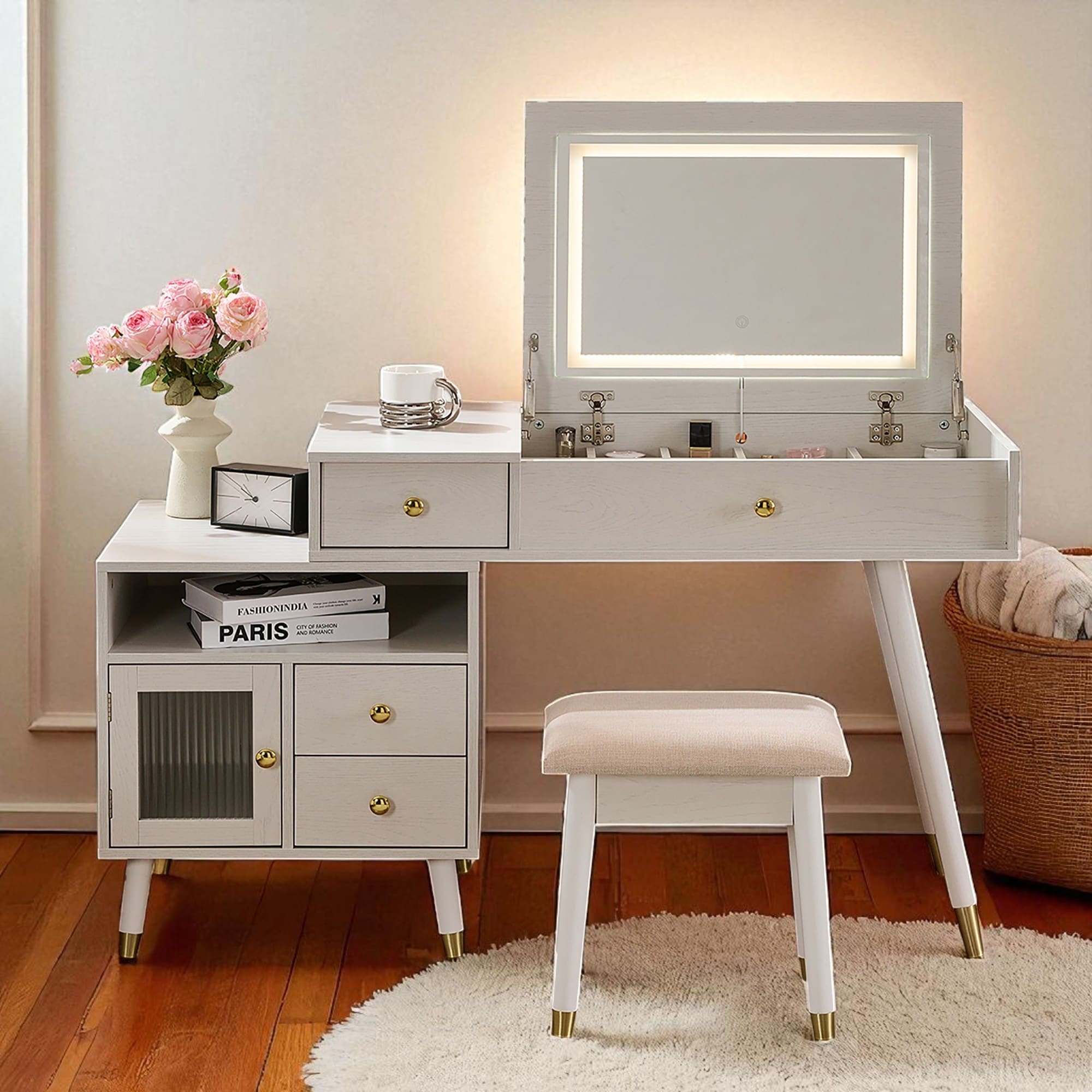 3-in-1 Vanity Desk with Lighted Flip-Top Mirror, Adjustable Side Cabinet, Makeup Table with Stool & Storage Drawers