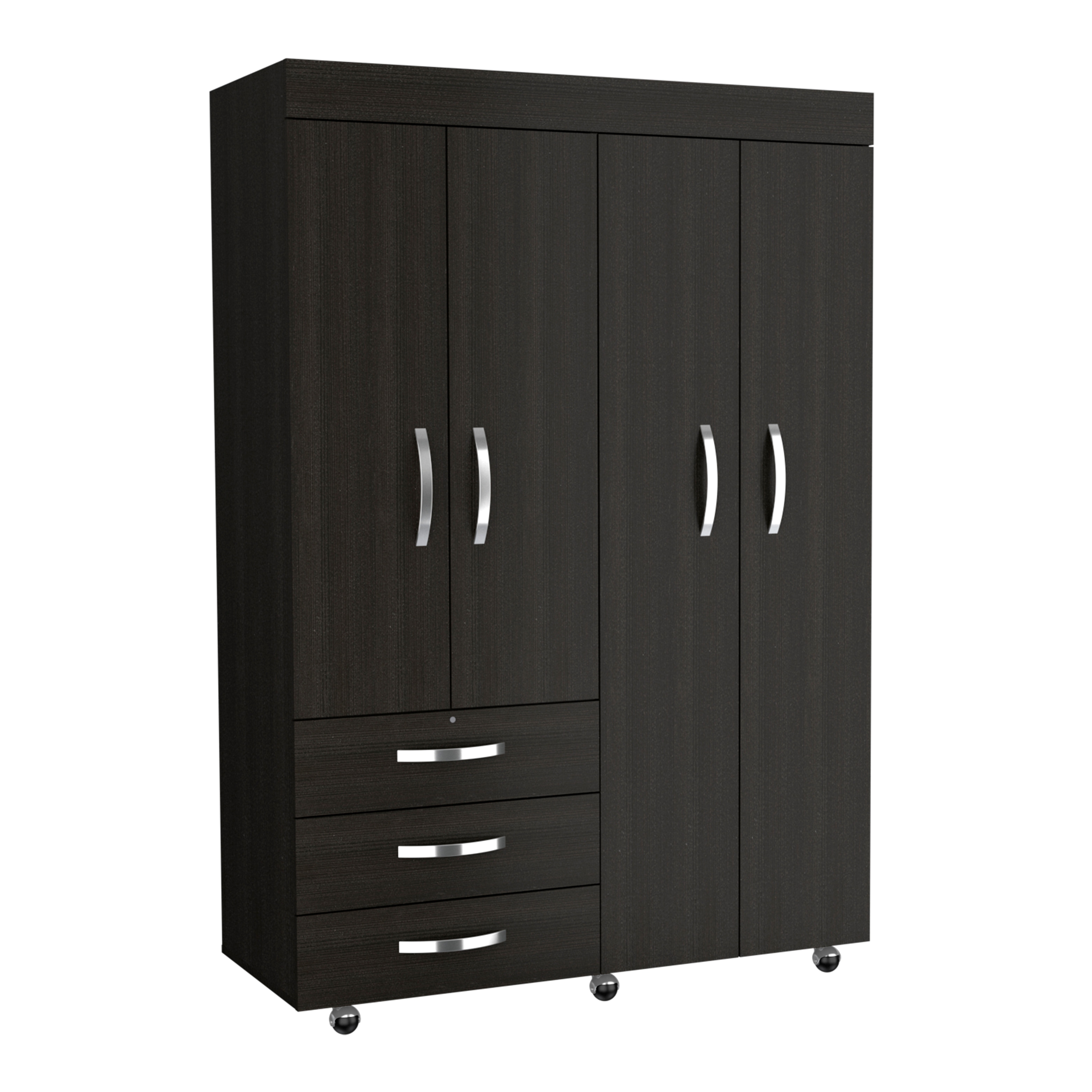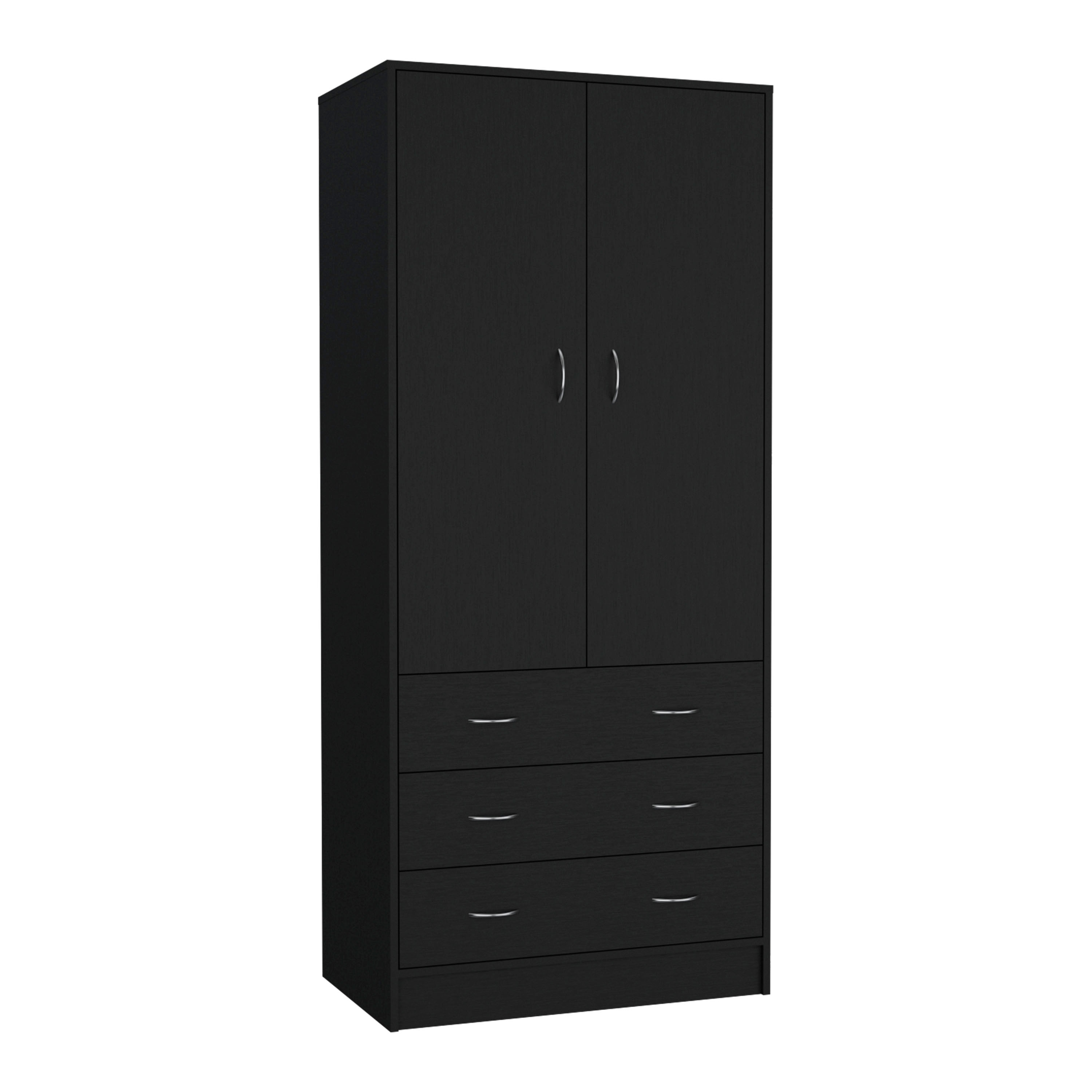 Mobile Armoire, With Hanging Rods, Double Door Cabinet, Three Drawers, Two Shelves Black