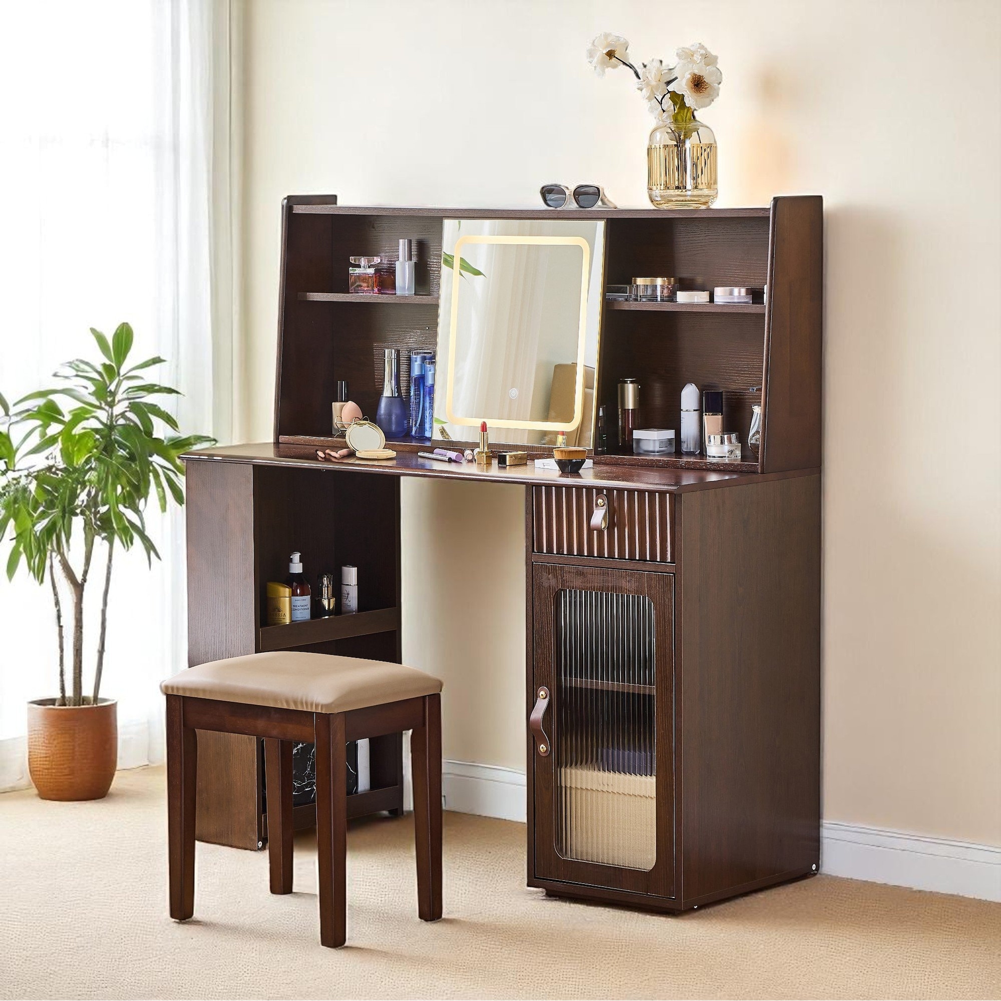Makeup Vanity Desk with 3-Color LED Mirror, Storage Shelves & Drawer, Fluted Design Dressing Table in Walnut Finish