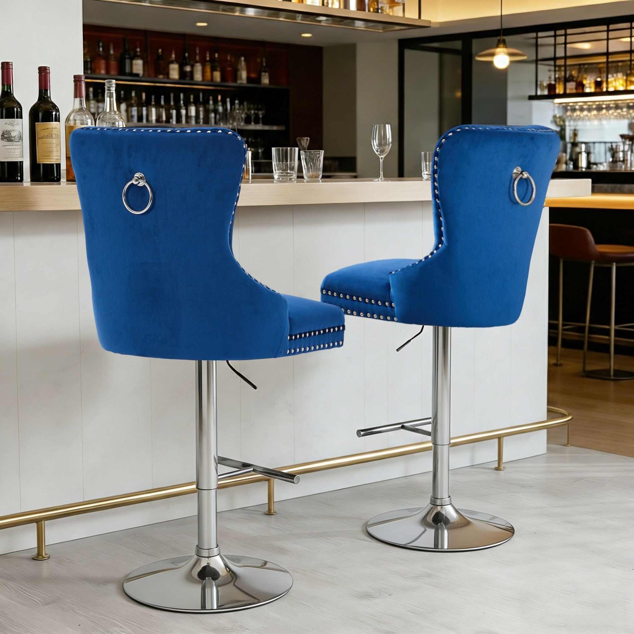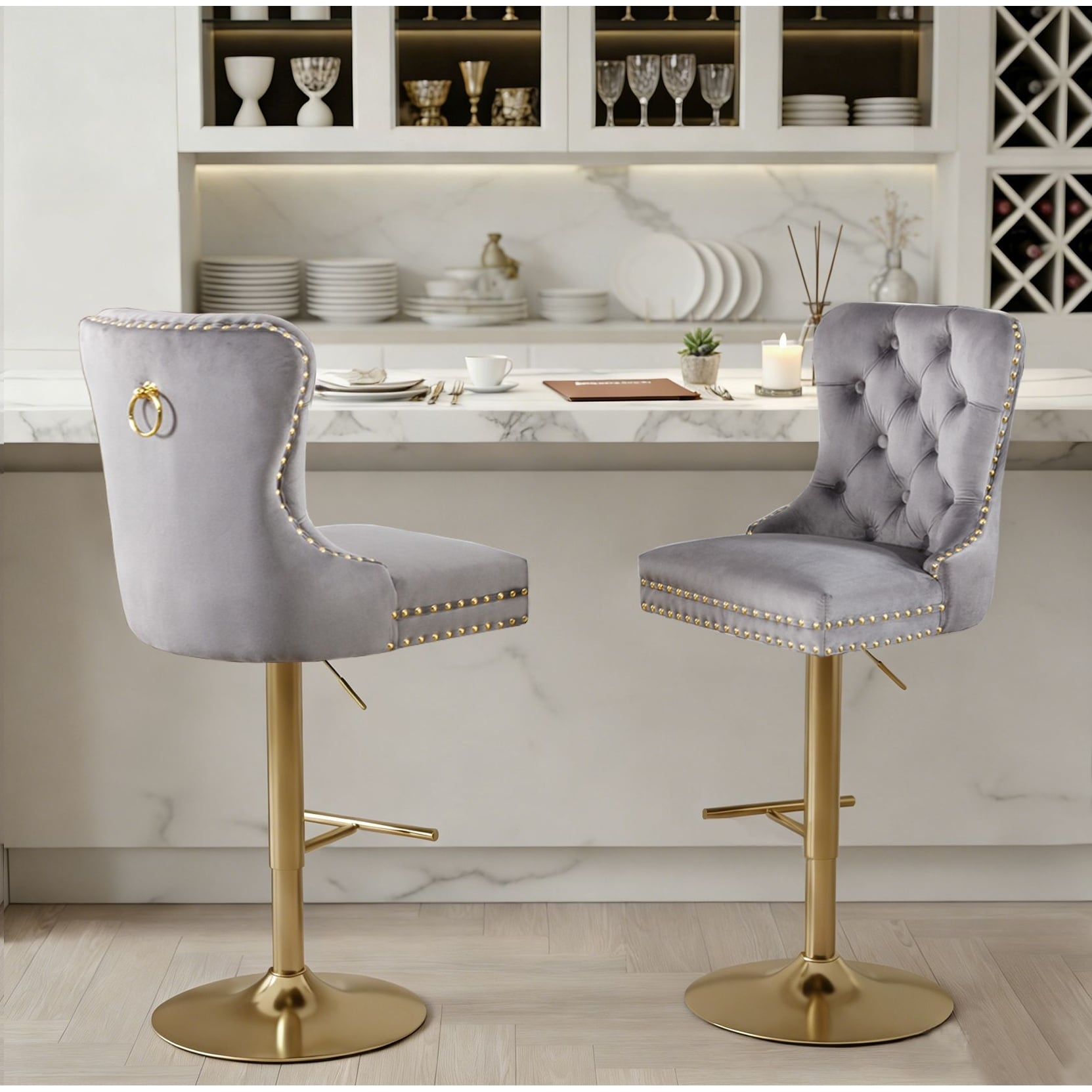 Set of 2 Velvet Adjustable Bar Stools with Golden Legs