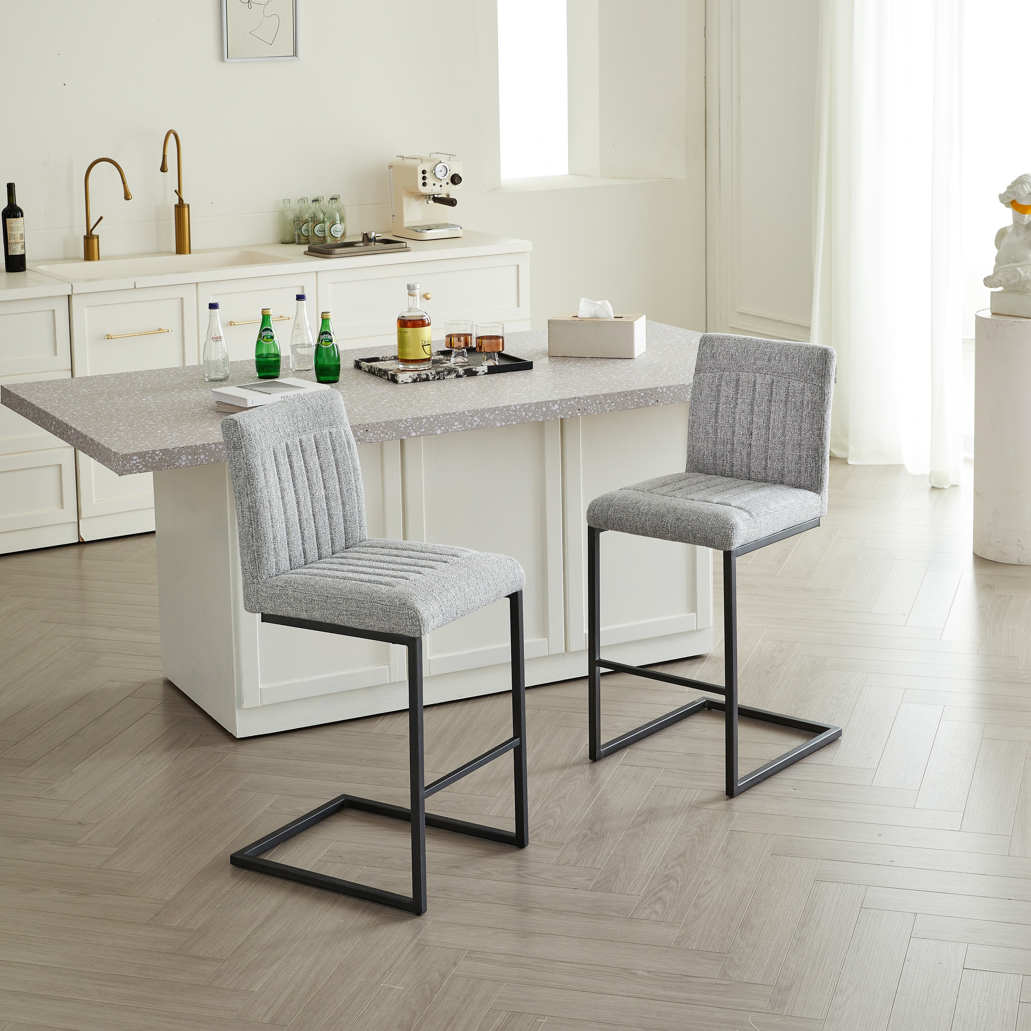 Set of 2 Light Gray Fabric Bar Stools, Sturdy Black Metal Frame, Counter Height for Kitchen & Living Room