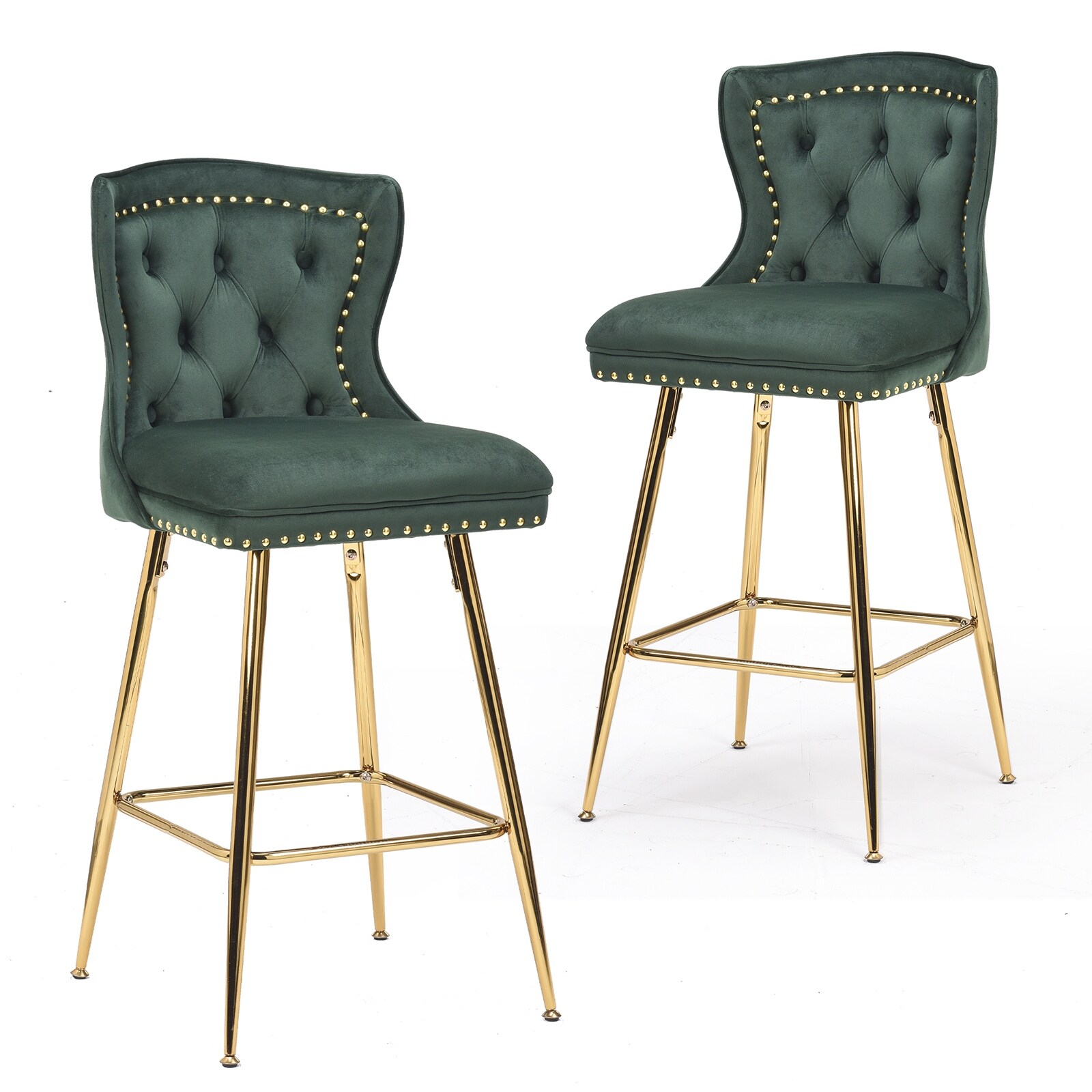Set of 2 Velvet Counter Height Bar Stools with Metal Legs, Button Tufted and Nailhead Trim for Kitchen Island Dining Room Pub