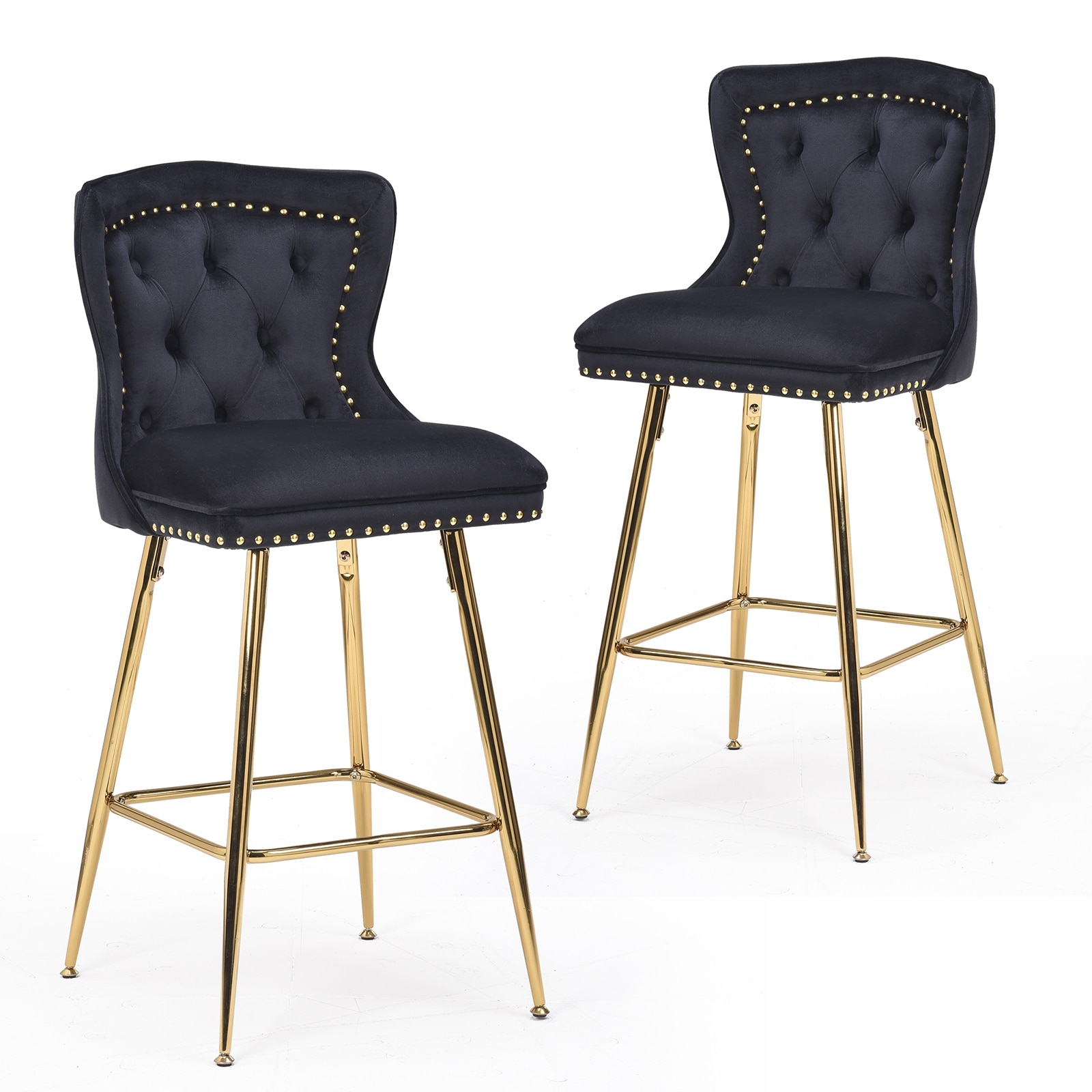 Set of 2 Velvet Counter Height Bar Stools with Metal Legs, Button Tufted and Nailhead Trim for Kitchen Island Dining Room Pub