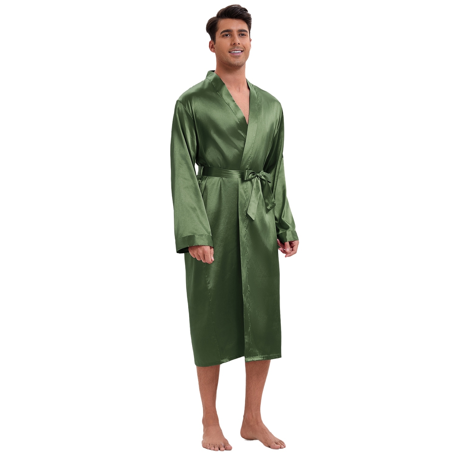 Satin Robe for Men's Long Sleeve Kimono Bathrobe Sleepwear with Shorts Set