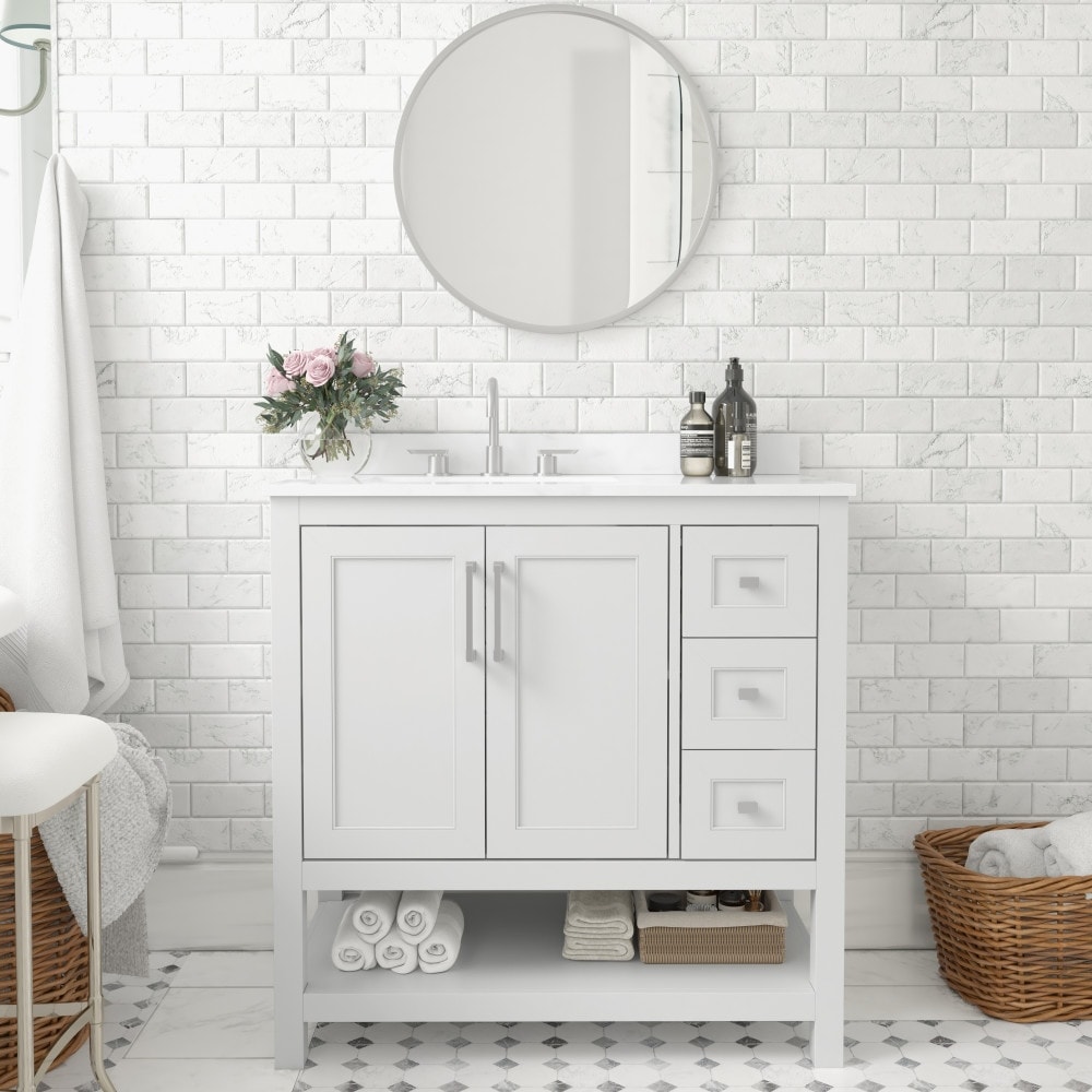 36" Bathroom Vanity with Ceramic Sink - Solid Wood, 3 Soft-Close Drawers, Freestanding