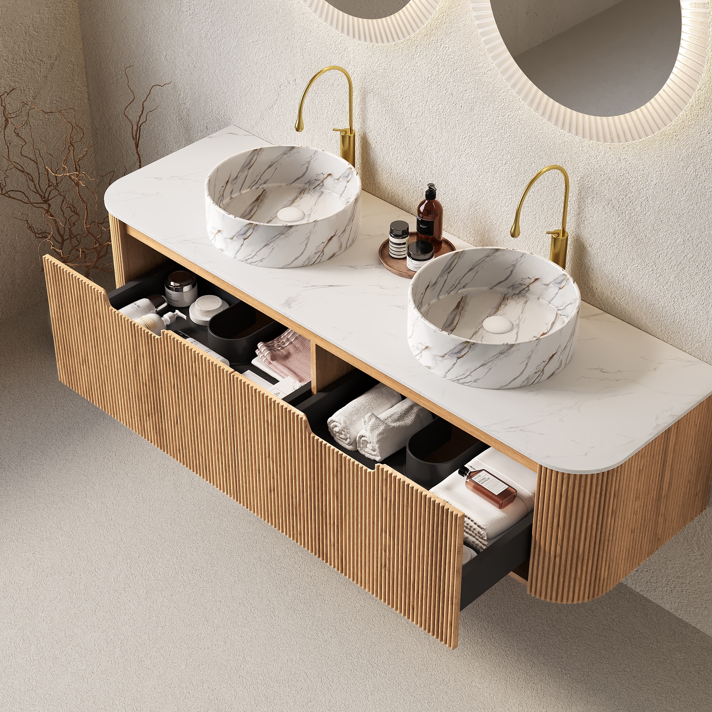 GDFStudio - Dina 60" Curved Edges Striped Bathroom Vanity with 2 White Stone Ceramic Basins, 2 Drawers, NO Faucet