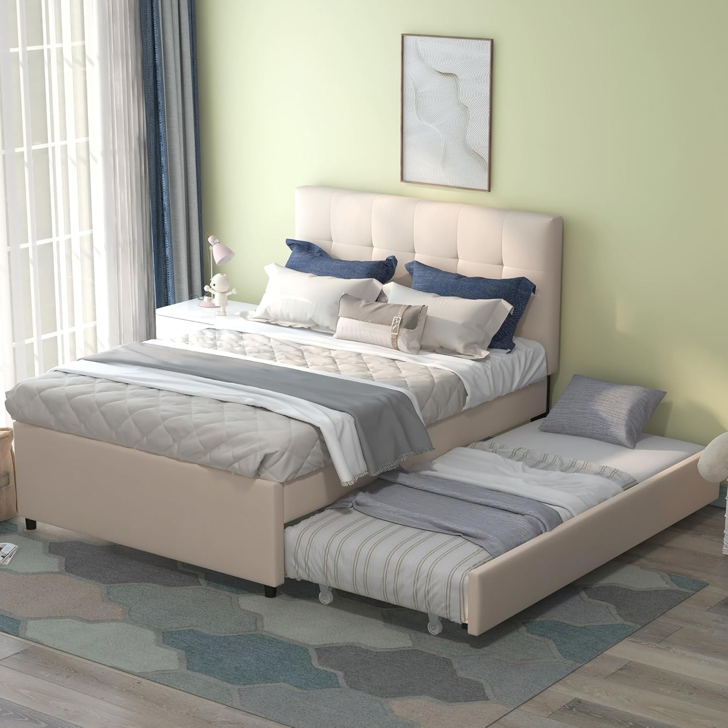 Full Over Twin Pull Out Platform Bed with Trundle, Upholstered Headboard & Wooden Slats, No Box Spring Needed, Beige