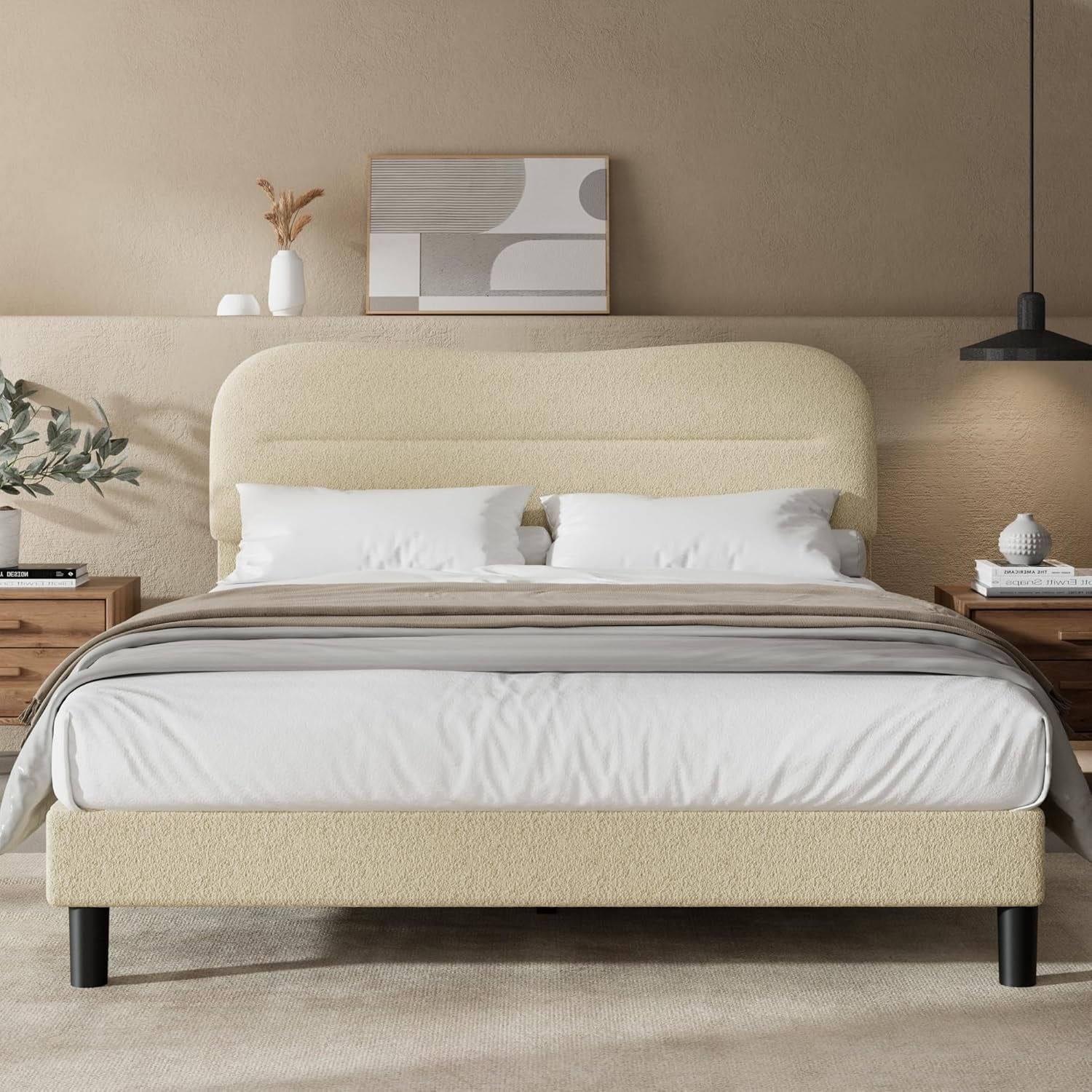 Queen Size Upholstered Bed Frame with Soft Boucle Fabric Headboard, No Box Spring Needed, Noise Free
