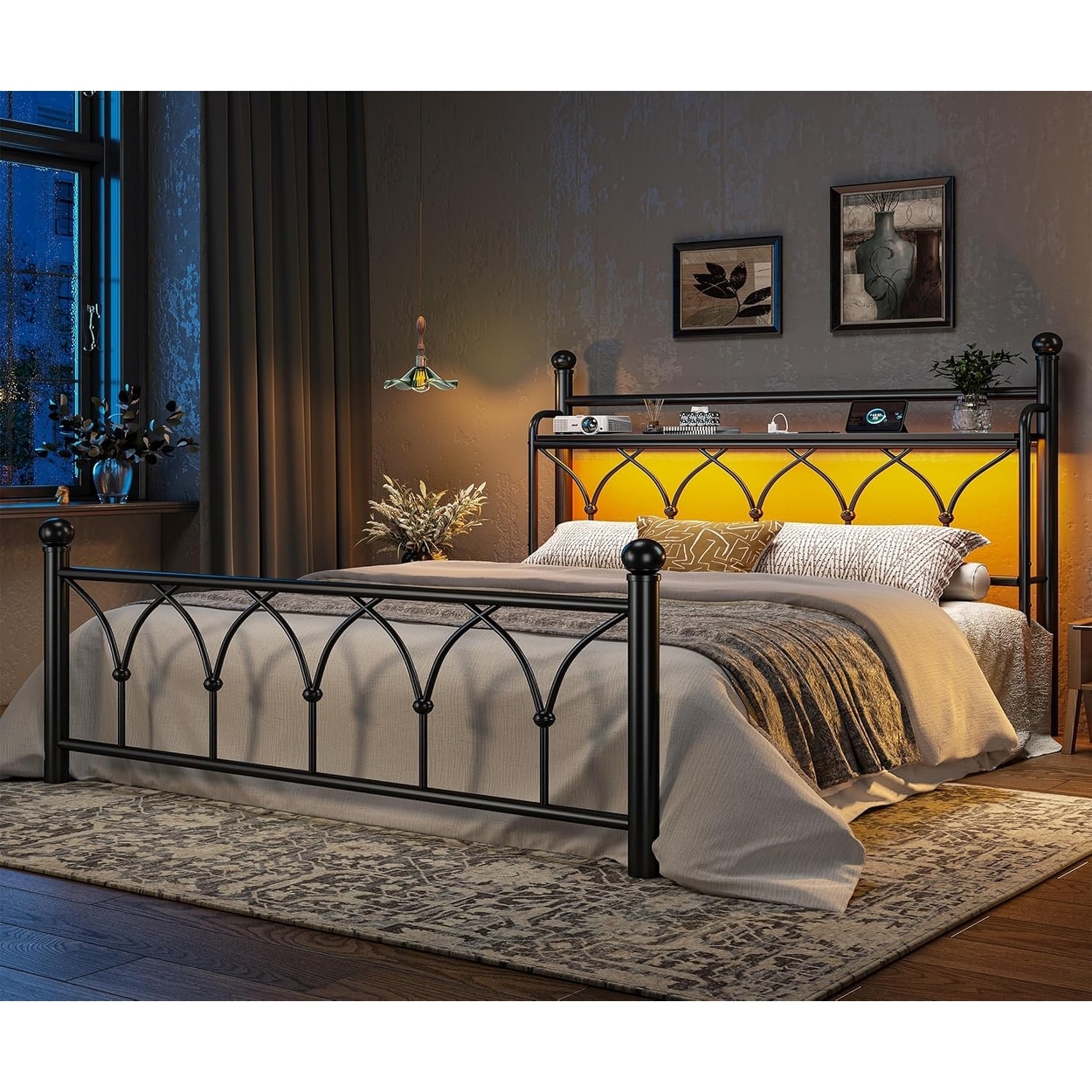 Queen Bed Frame with LED Lights, Storage Headboard, Power Outlets, Sturdy Steel Construction, Noise-Free Design