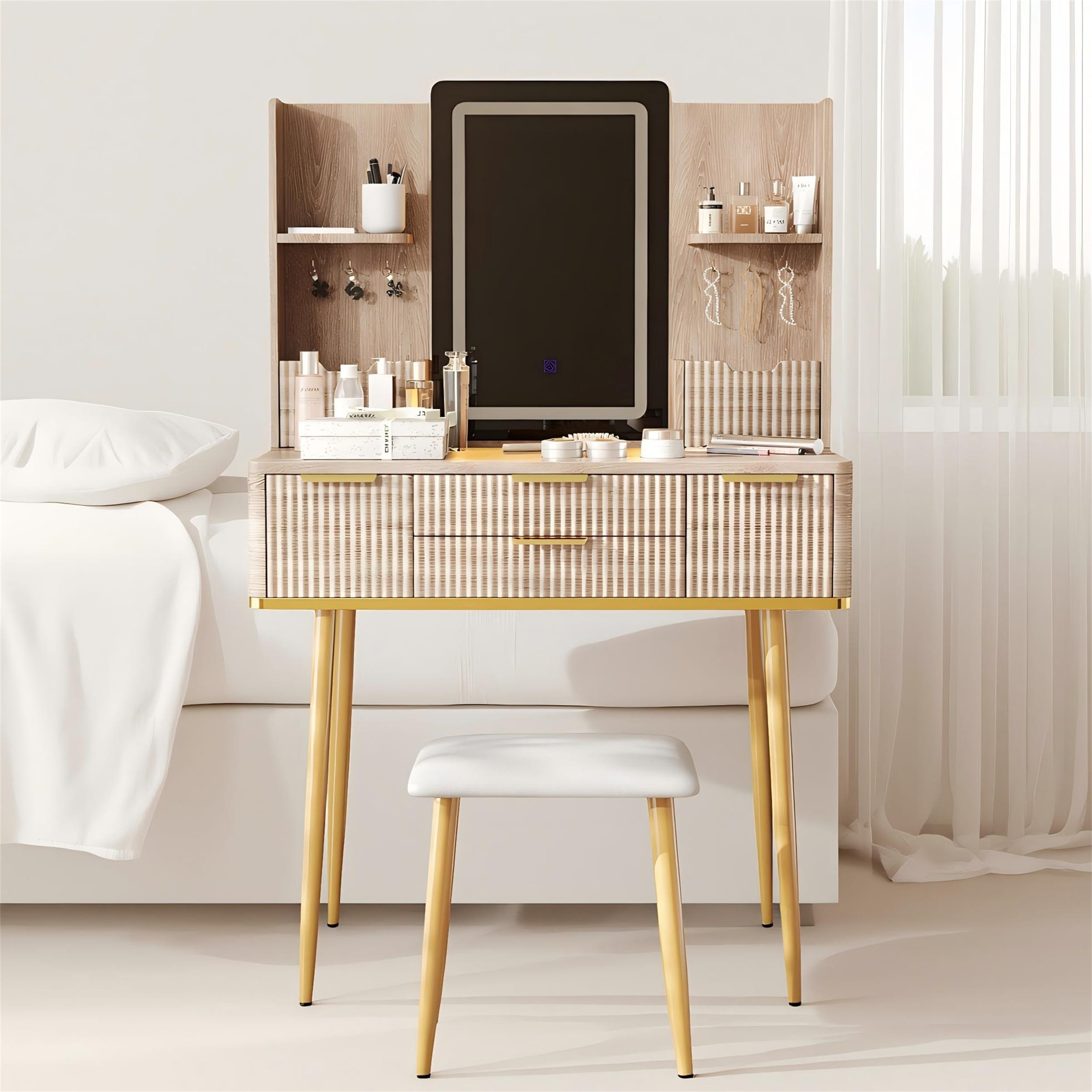 Makeup Vanity with LED Mirror, 4 Drawers, Jewelry Organizer, PU Stool