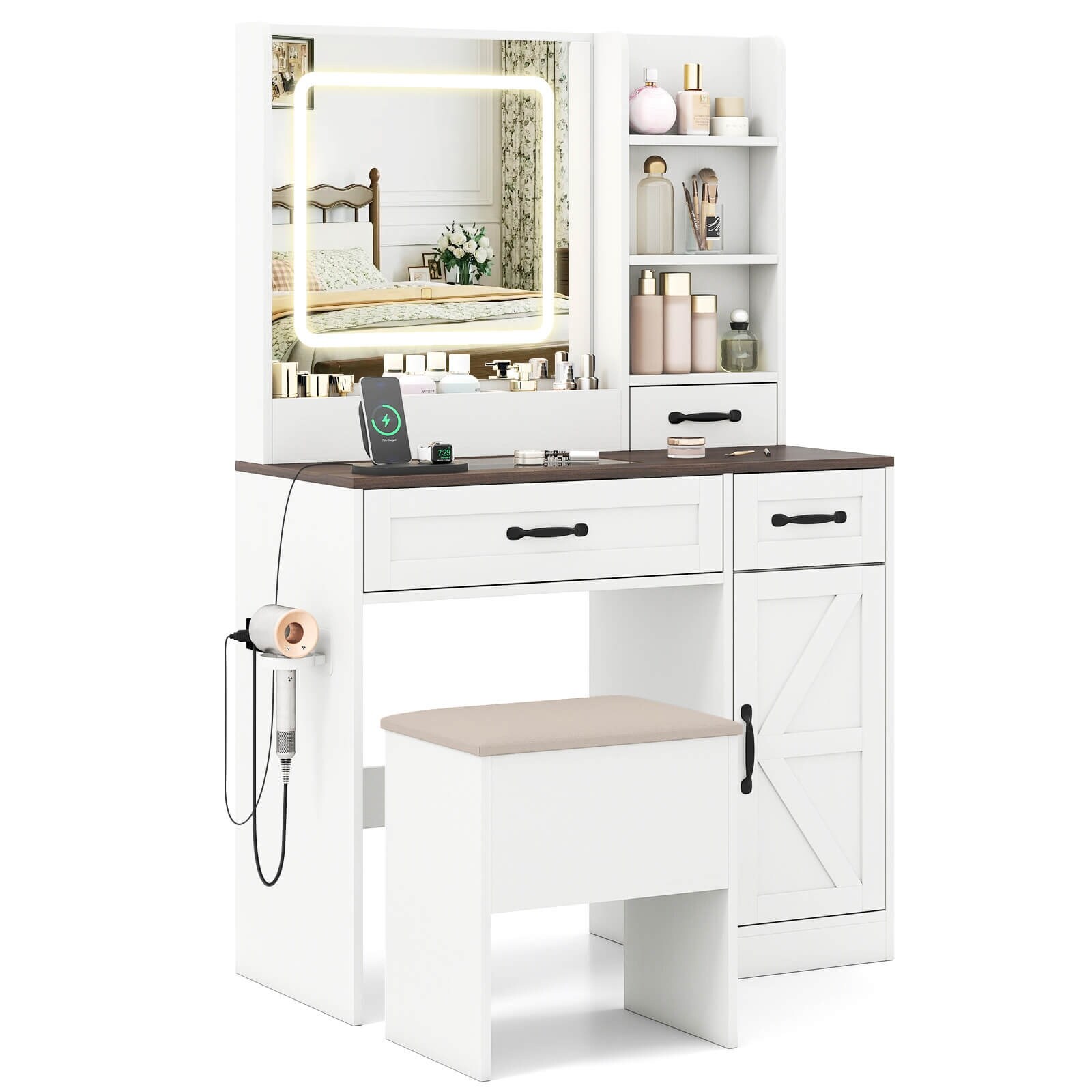Vanity Set with Mirror and Stool - Makeup Vanity Table with Storage Drawers and Organizer, Space-Saving Design