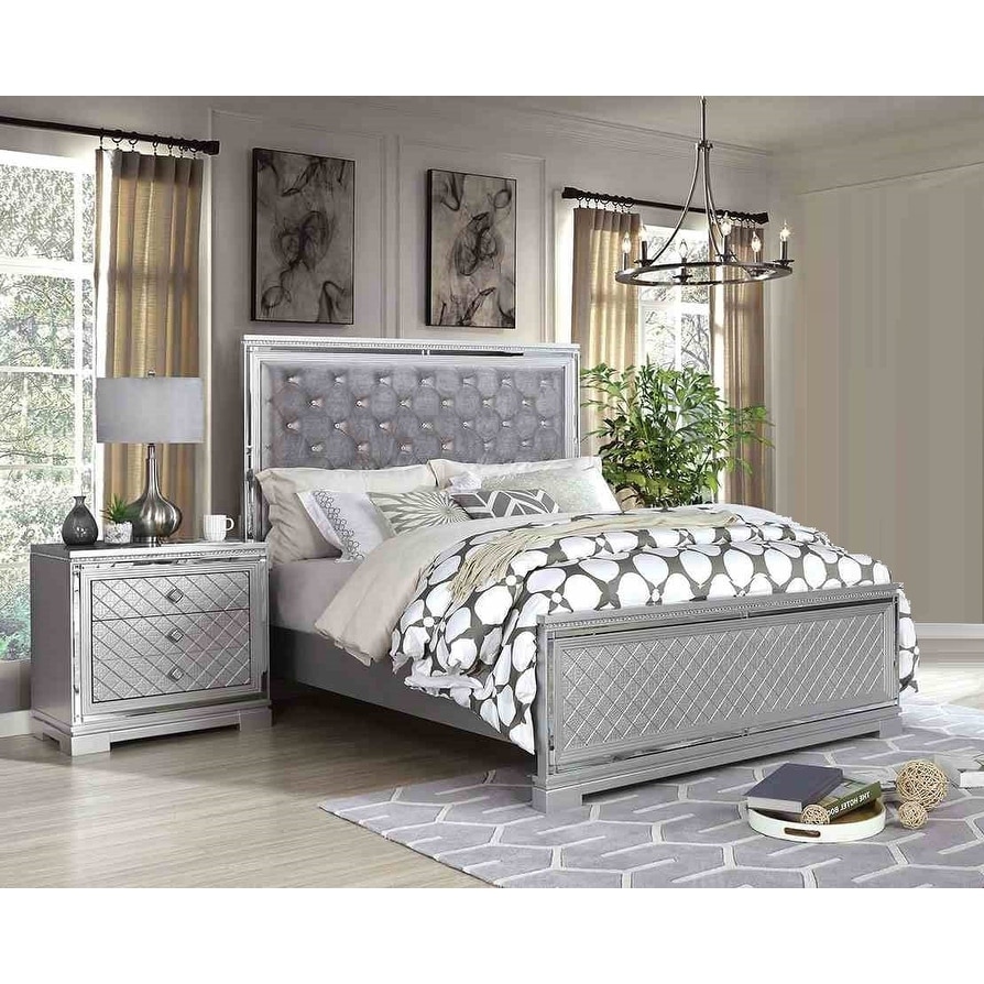 Glam 3pc Silver Finish Tufted Bed 2x Nightstands Bedroom Set