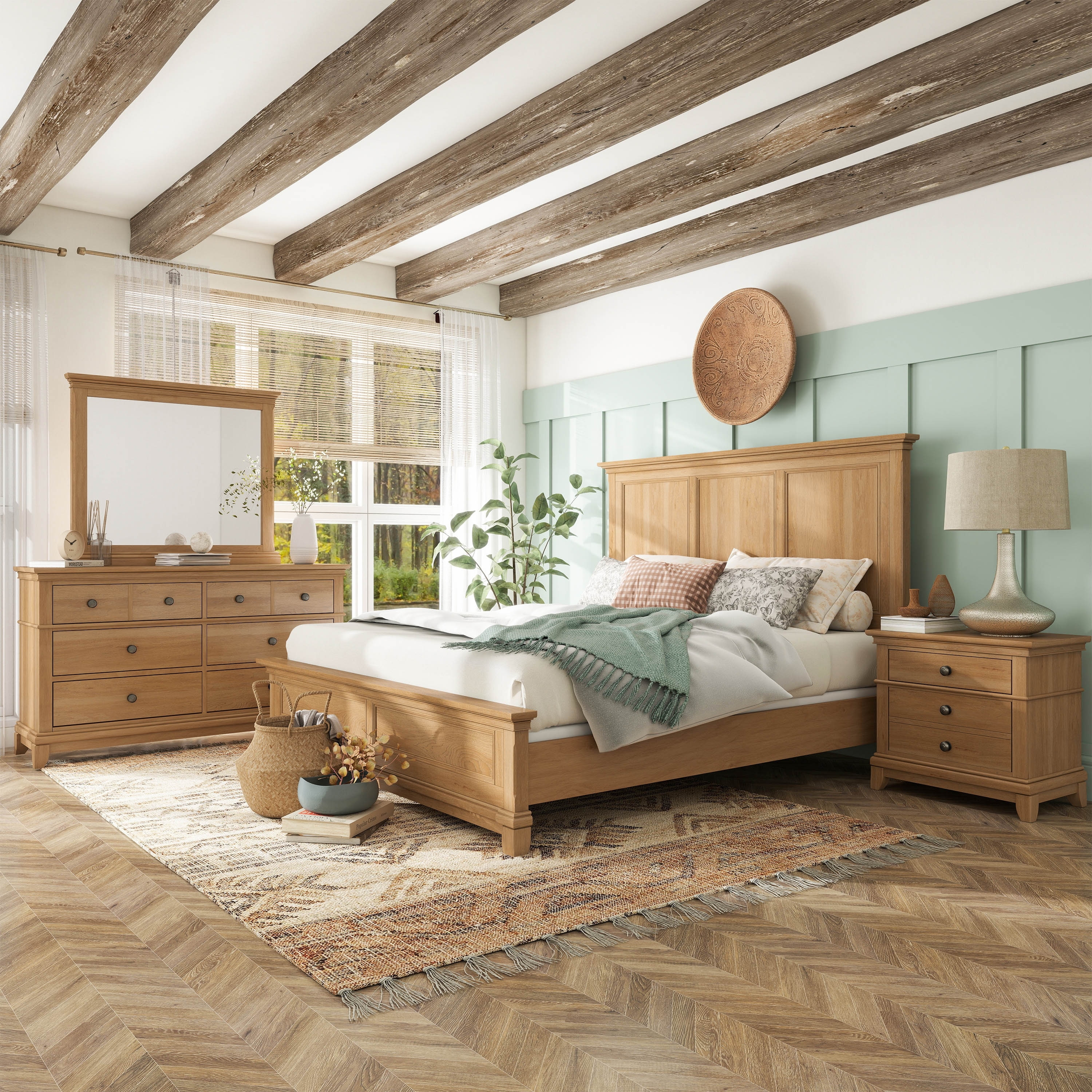 Furniture of America Wellington Farmhouse 4-Piece Natural Oak Wood Panel Bedroom Set