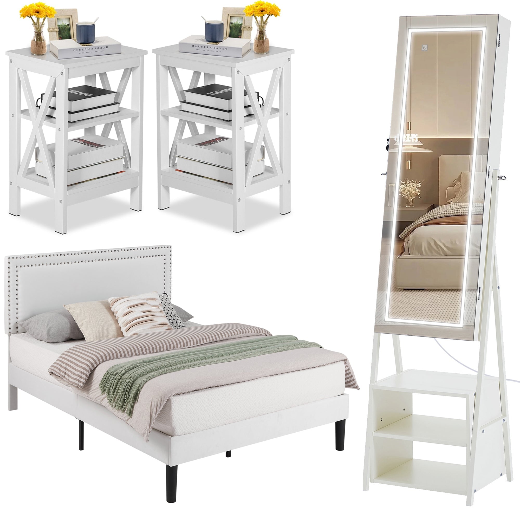 VECELO White 4 Piece Bedroom Set Upholstered Height-Adjustable Bed Nightstand Standing Jewelry Mirror Cabinet