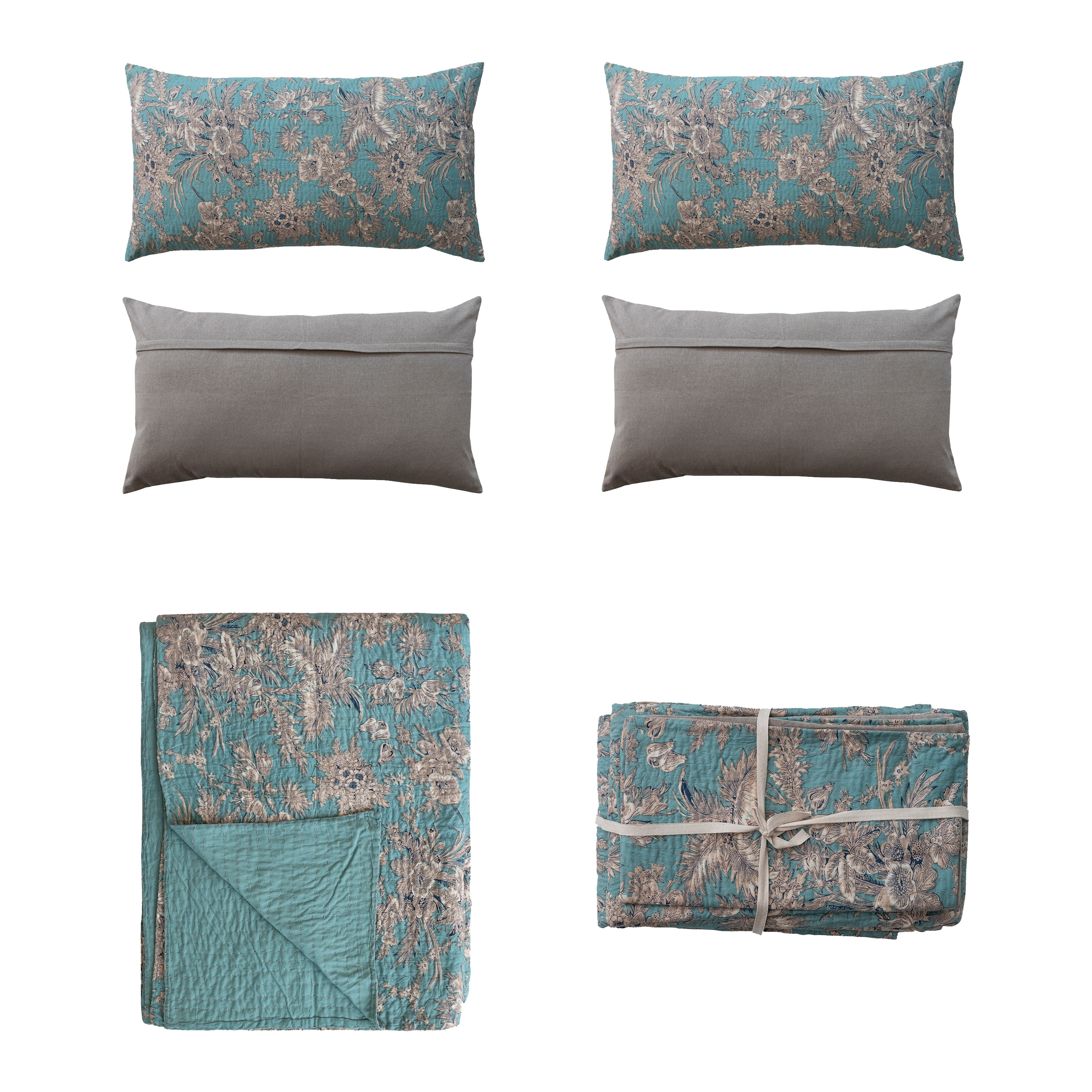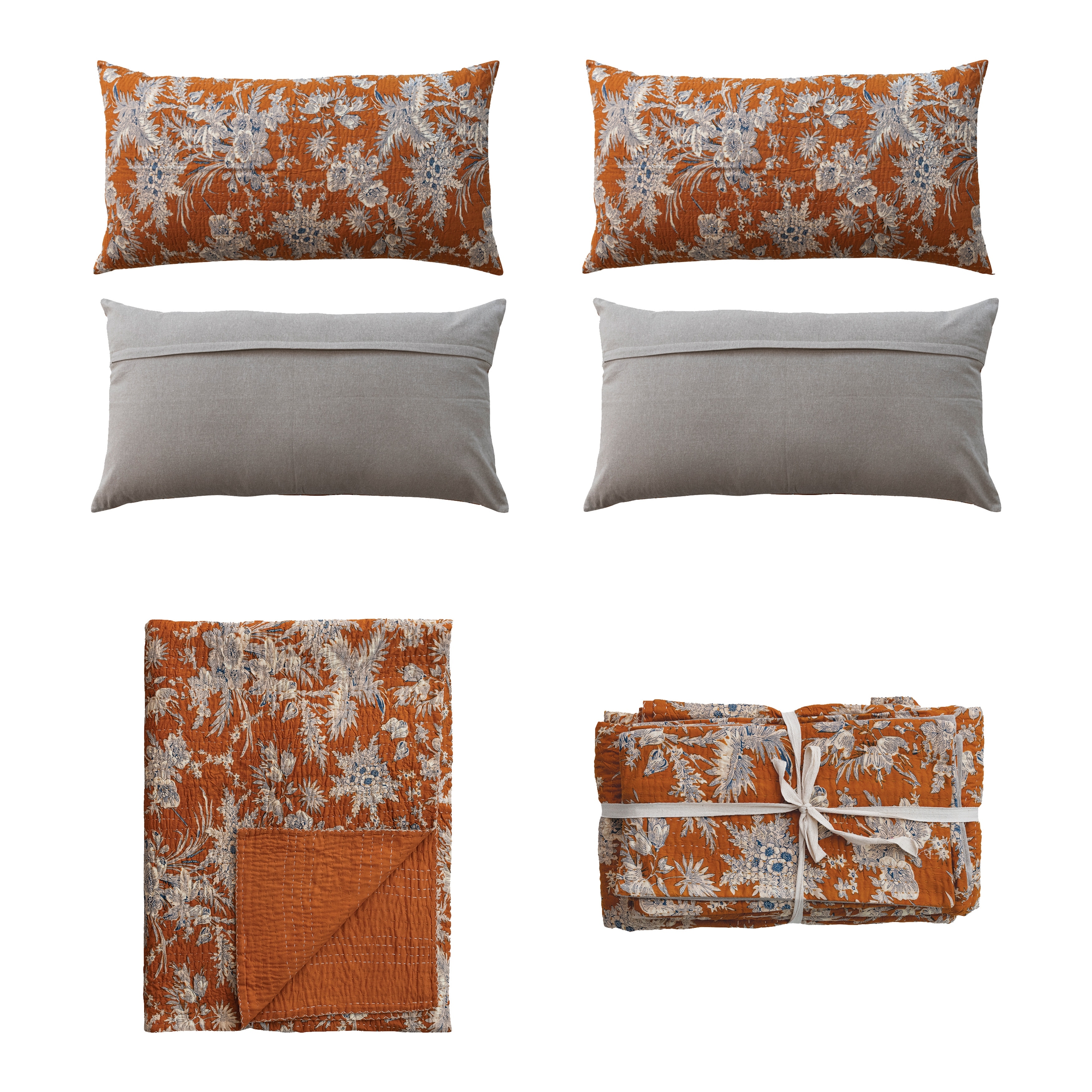 Cotton Voile Printed Bed Cover with Florals, Hand-Embroidered Kantha Stitch and 2 King Shams