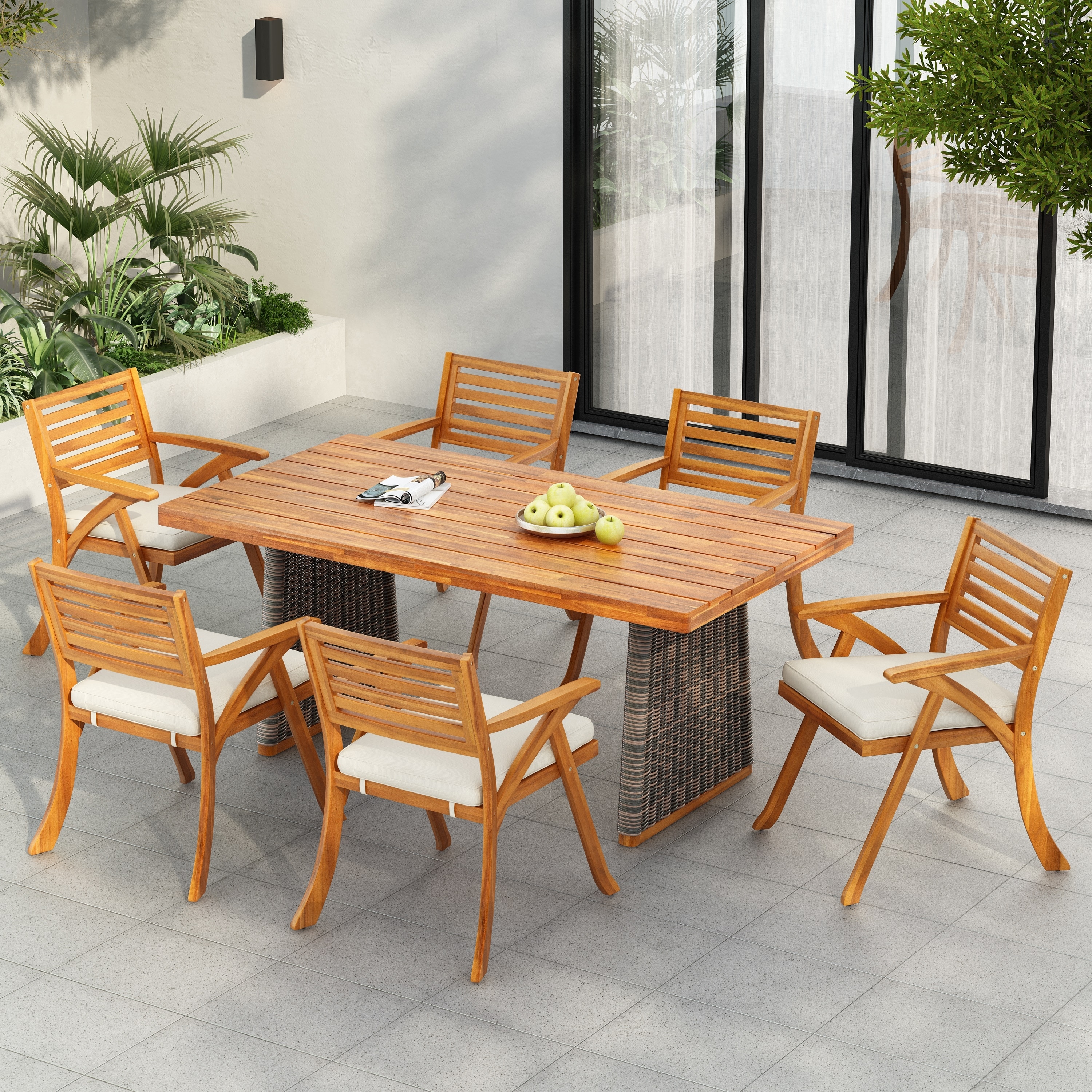 Roomfitters Outdoor 7-Piece Acacia Wood Dining Set with Cushions, Handwoven Rattan Legs, Grey Wicker