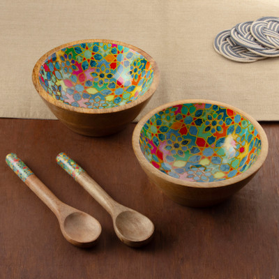 Galaxy of Blossoms,'4 Piece Floral Mosaic Wood Salad Bowl Set with Spoons'