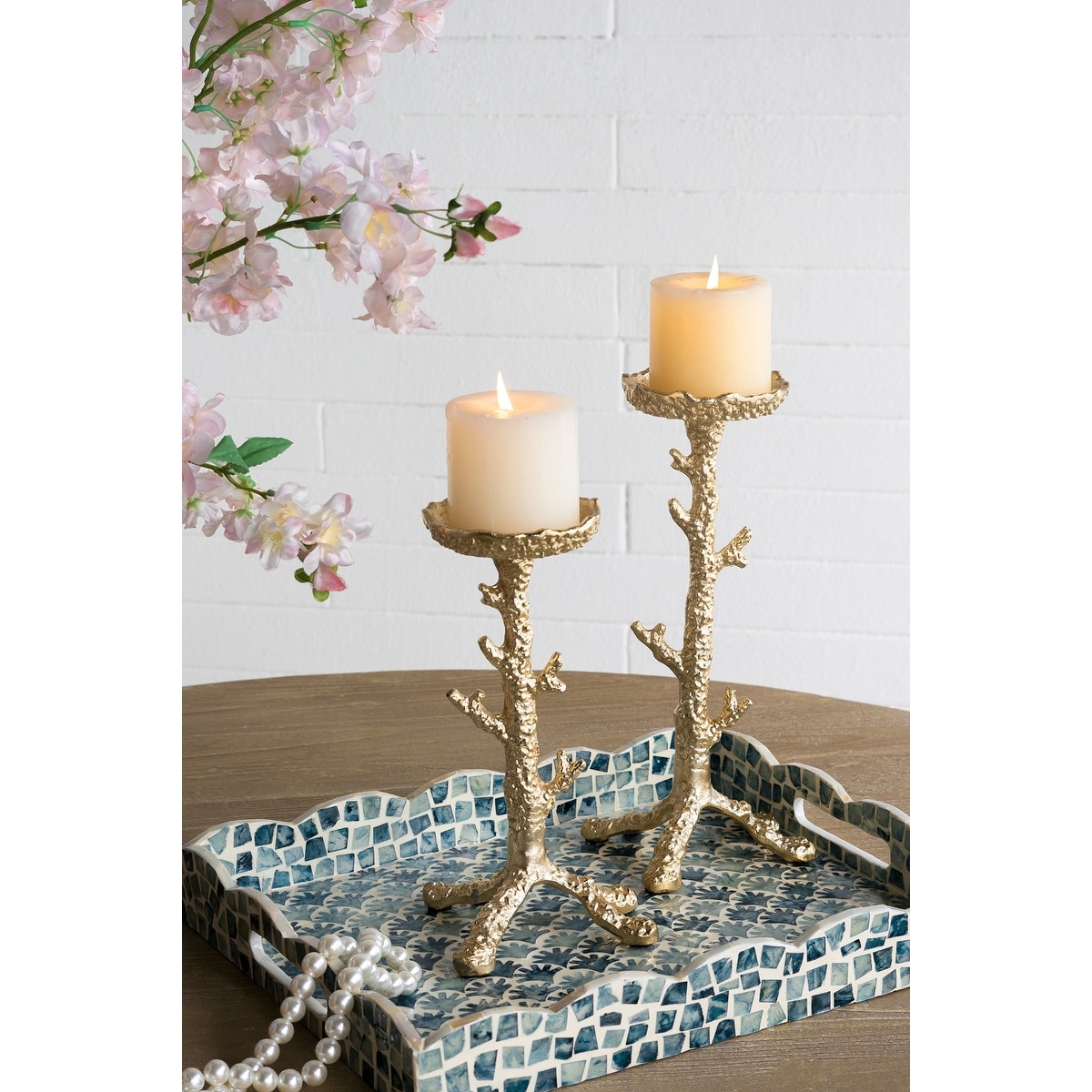Gold Aluminum Pillar Candle Holder With Coral Branch Design, S:4.7x4.7x9.8" L:4.7x4.7x11.8", Set of 2