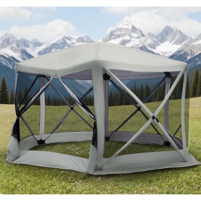 6-Sided Hexagon Pop Up Party Tent Gazebo with Mesh Netting Walls & Shaded Interior, 12' x 12', Beige