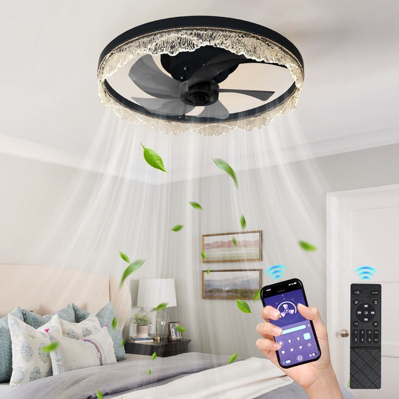 Crystal Flush Mount Ceiling Fan With Light And Remote, Black Ceiling Fan For Bedroom, Living Room