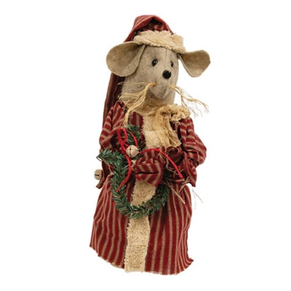 Red Taupe Felt Fabric Marlene Santa Jammies Stuffed Mouse with Holiday Wreath and Bells - 4.25 x 4.25 x 12.50 in