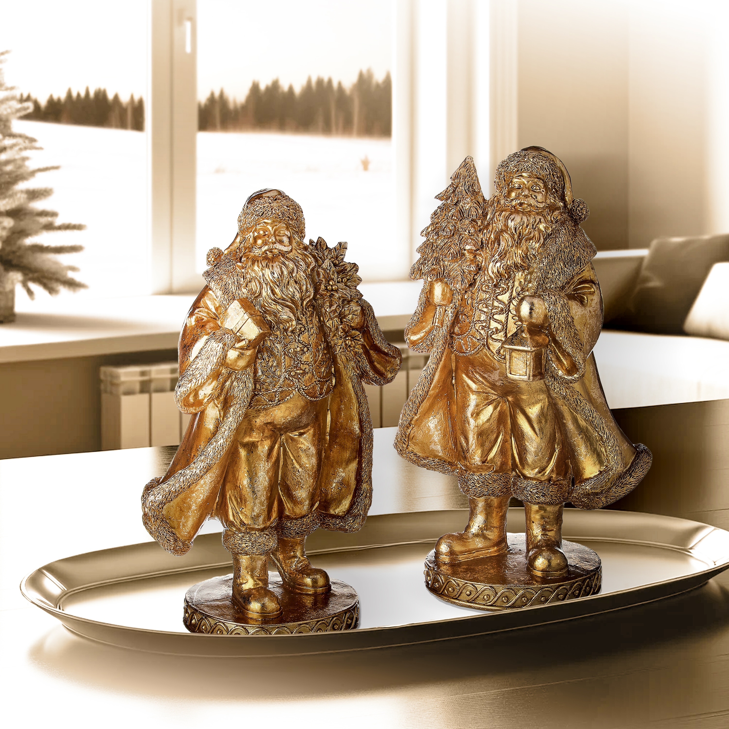 10" Resin Santa With Tree and Wreath Set of 2
