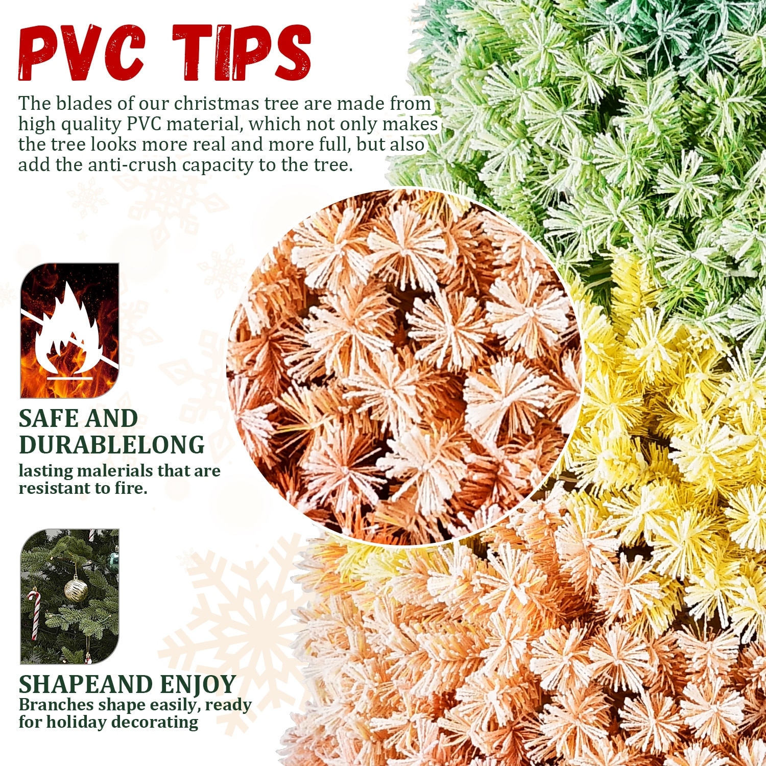 6ft Rainbow Gradient Flocked PVC Christmas Tree with 1326 Tips, Colorful Full-Bodied Artificial Pine with Snowy Finish, Hinged
