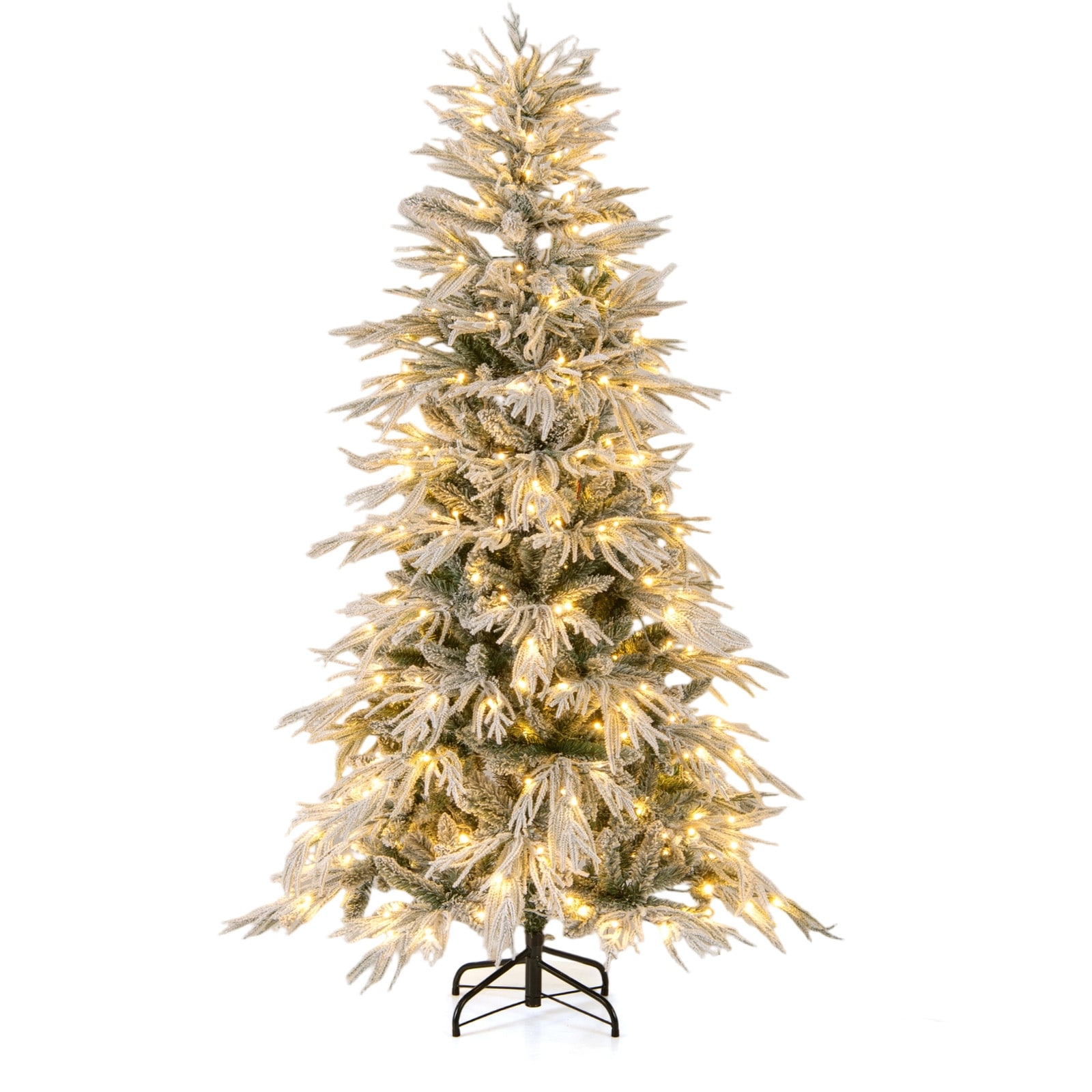Pre Lit Snow Flocked Artificial Christmas Tree with Warm White LED Lights and Metal Stand