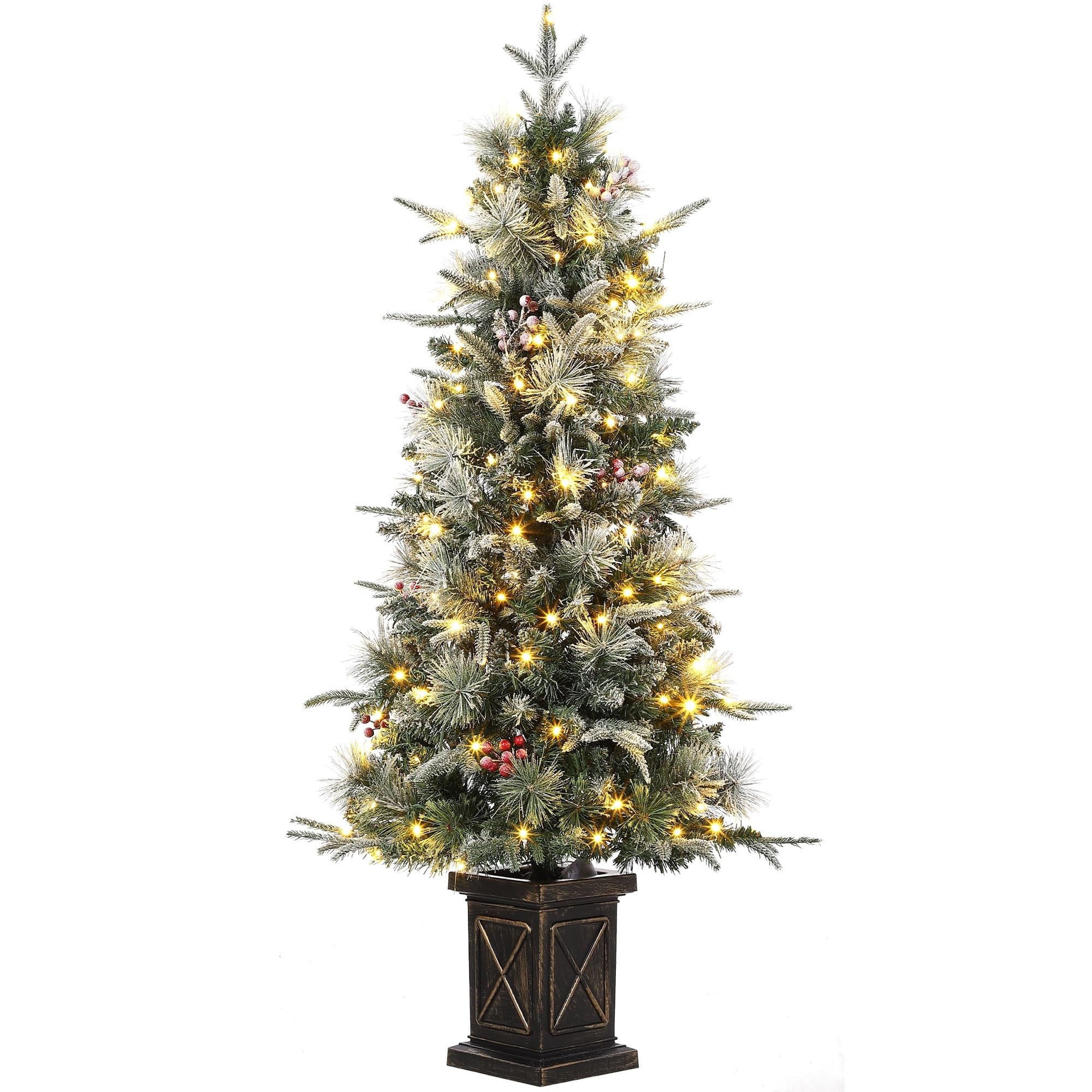 4.5ft Pre-Lit Christmas Tree with 108 LED Lights, 8 Modes, Red Fruits and Pine Cones, Potted Base