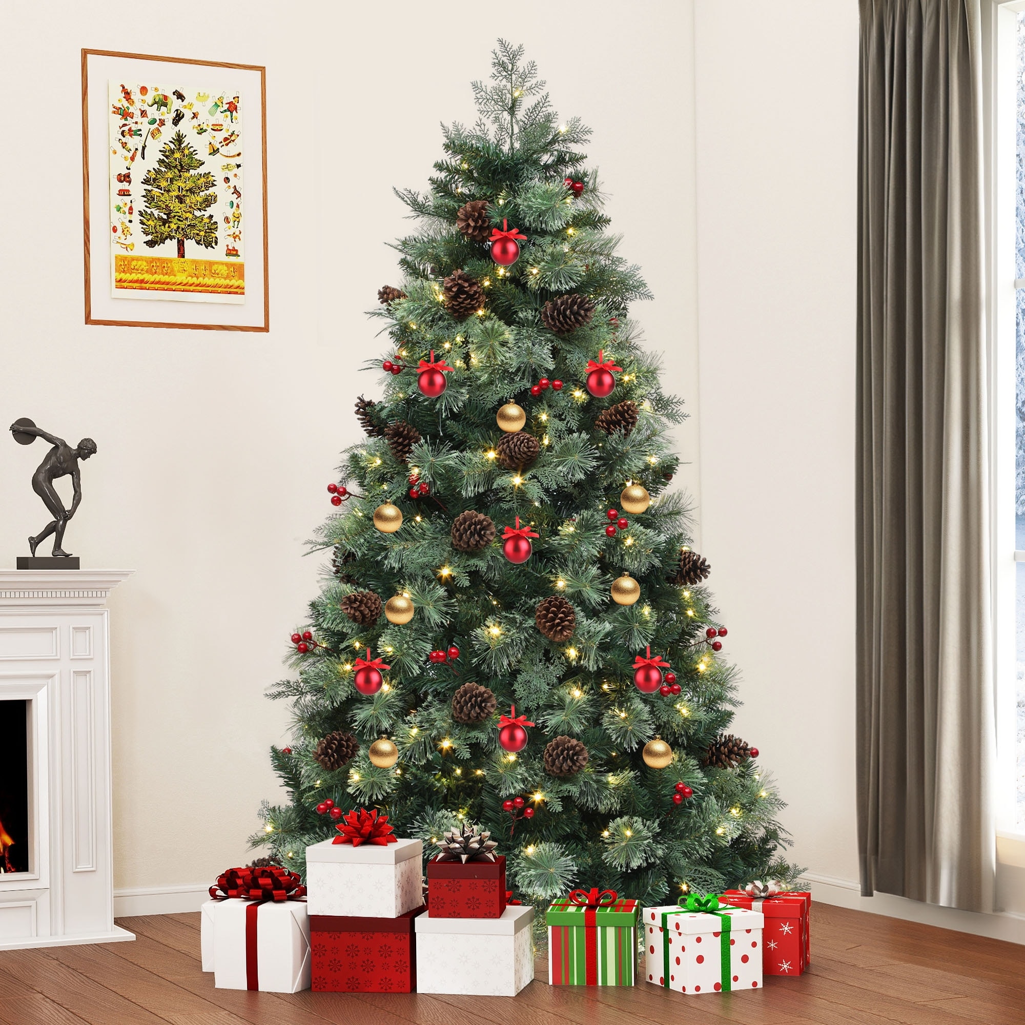 6/7.5ft Prelit Artificial Carolina Pine Christmas Tree with Remote, Green Artificial Hinged Christmas Tree w/ 1200 Mixed Tips