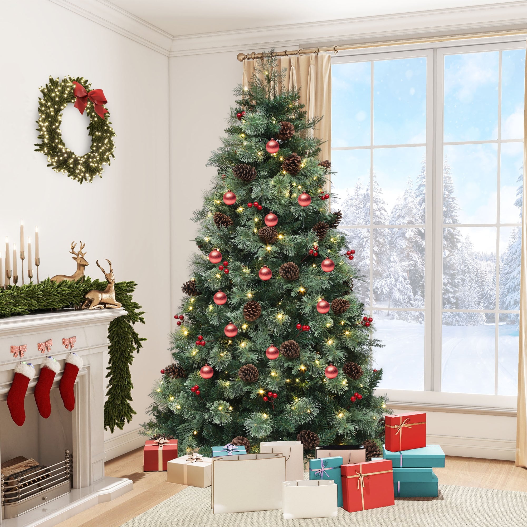 6/7.5ft Prelit Artificial Carolina Pine Christmas Tree with Remote, Green Artificial Hinged Christmas Tree w/ 1200 Mixed Tips