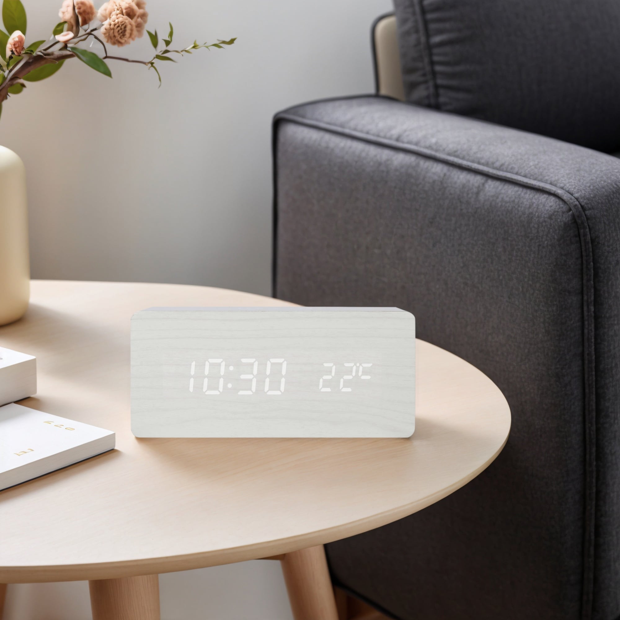 Digital Alarm Clock, Wood Grain Casing Design, Voice Wake-Up, Dimmable Display for Bedroom - 6.7"L x 3.1"W x 2.8"H
