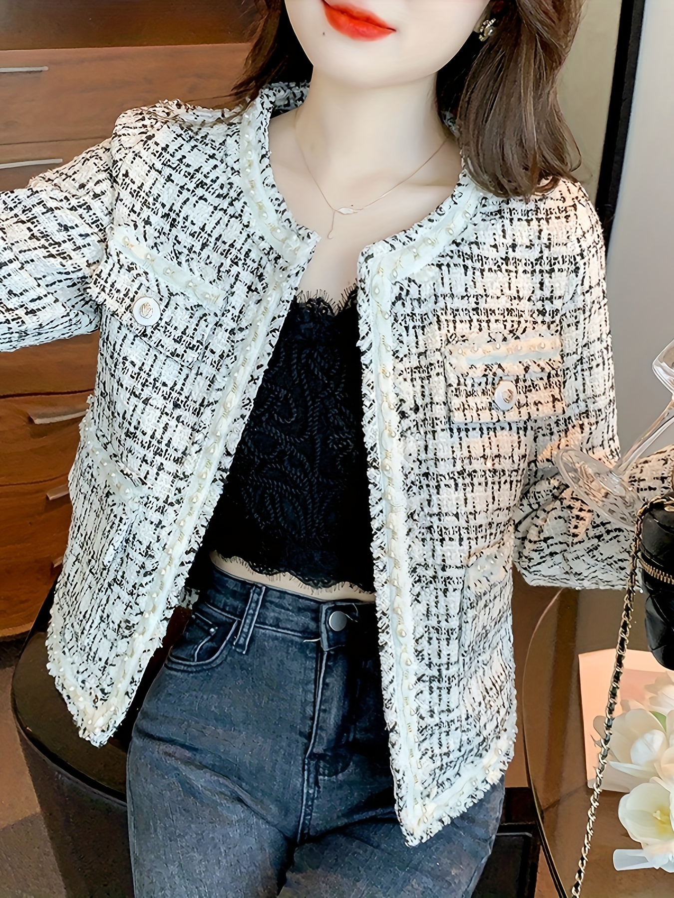 Plaid Print Open Front Slim Jacket Elegant Crew Neck Button Contrast Trim Jacket For Winter Women's Clothi Black X