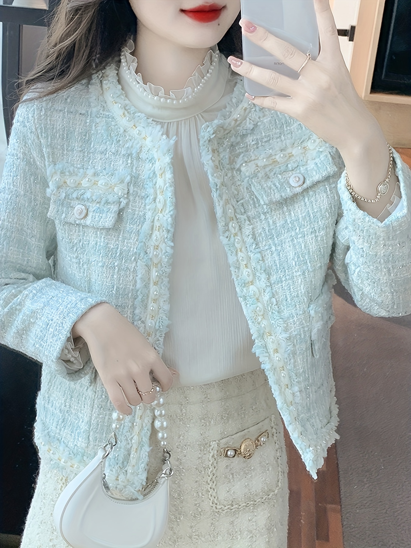 Plaid Raw Trim Jacket Vintage Open Front Long Sleeve Outerwear Women's Clothing Khaki L