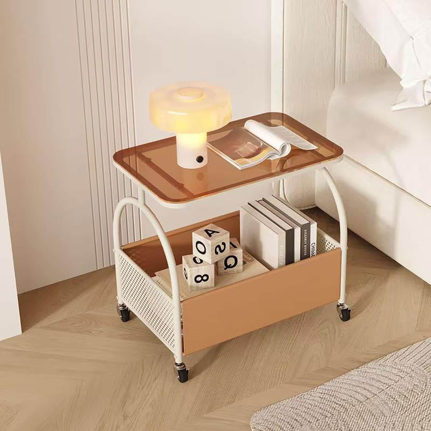 2-Tier Rolling Side Table with Glass Top & Storage Basket, Mobile End Table on Wheels