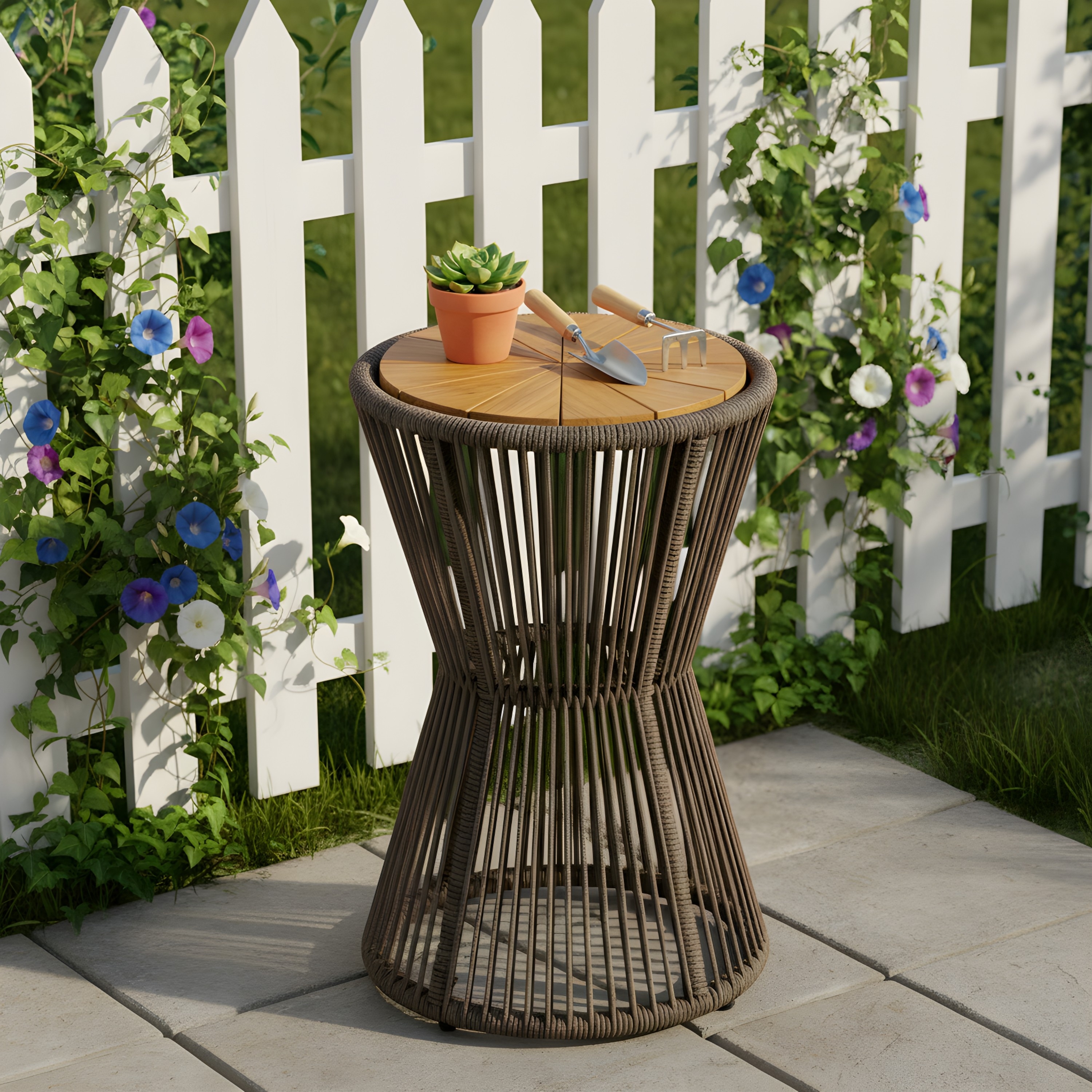 Outdoor Side Table, Dark Grey Rope and Acacia Wood, 25.80" Height, 16.14" Diameter, Elegant Long Hourglass Design