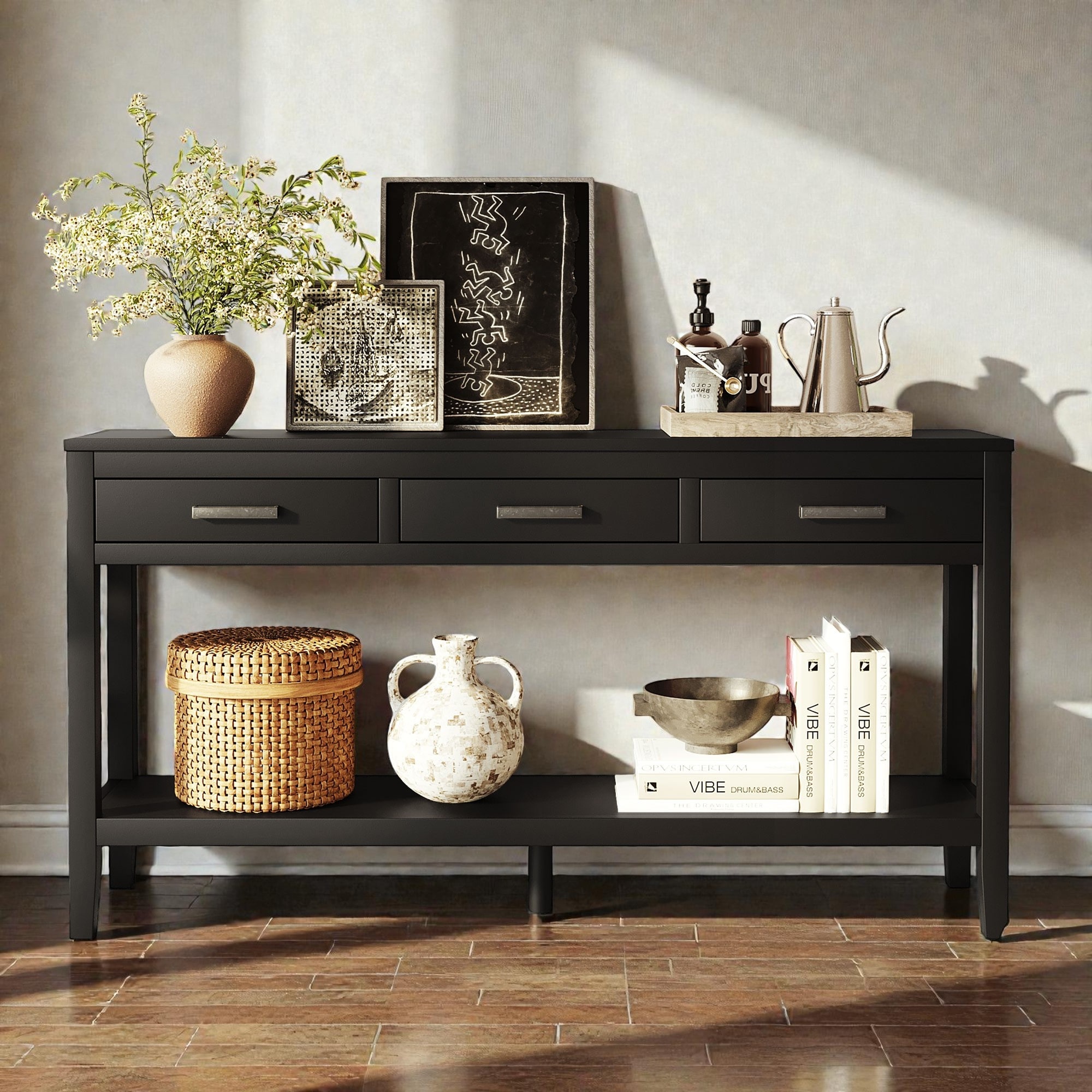 59.1 Inch Farmhouse Console Table with 3 Drawers and Bottom Shelf, Painted Entryway Sofa Table