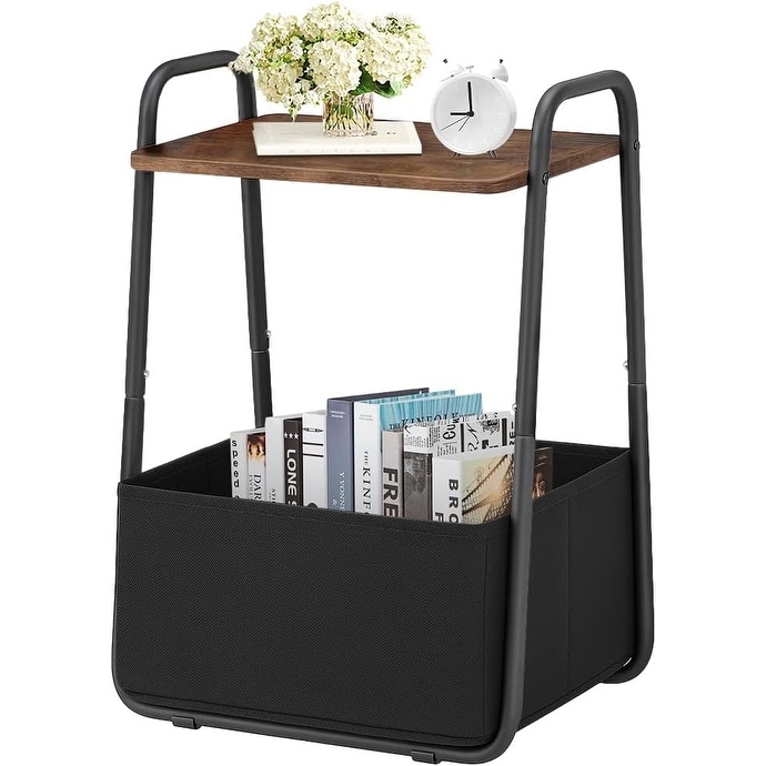 Rustic Brown Metal Frame Nightstand with Fabric Basket - Small Side Table for Bedroom, Living Room, Dorm