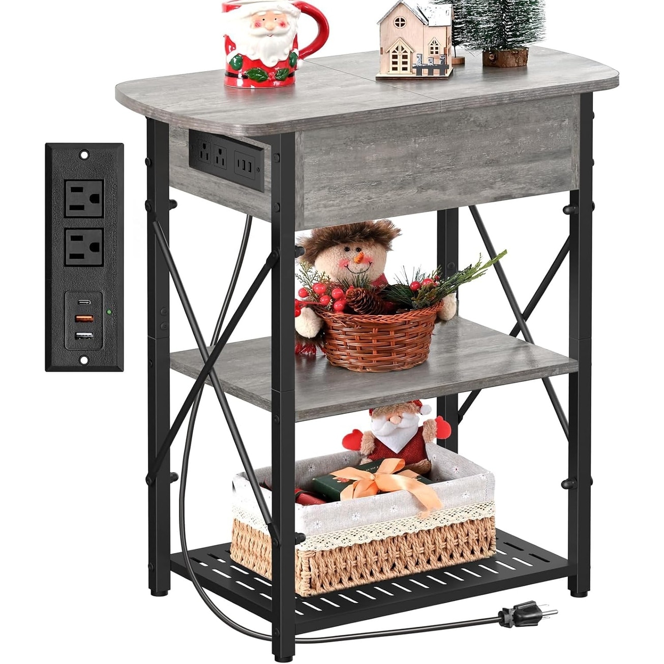 Narrow End Table with Charging Station, 3 USB Ports, 2 AC Outlets, Flip Top & Storage Drawer