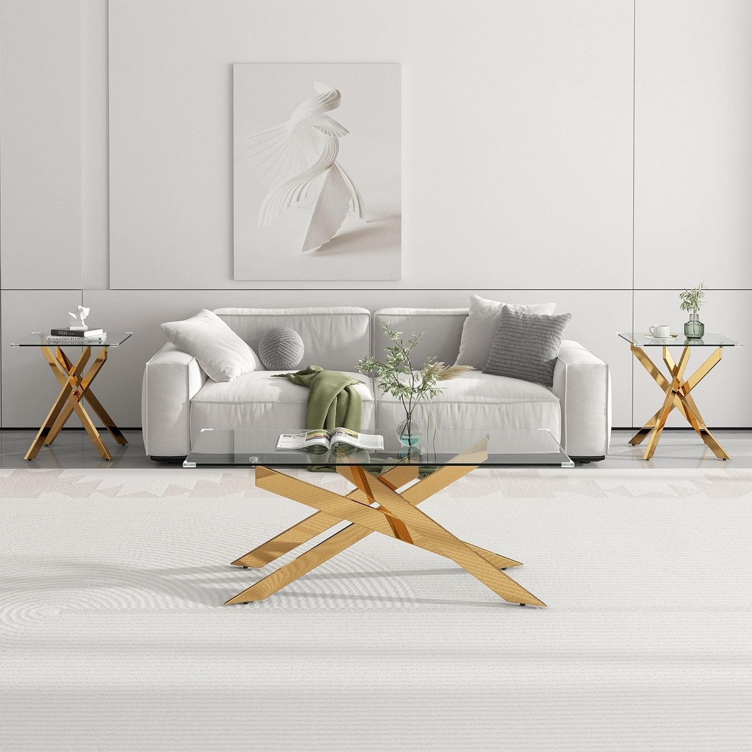3-Piece Living Room Table Set with Glass Tops and Metal Legs