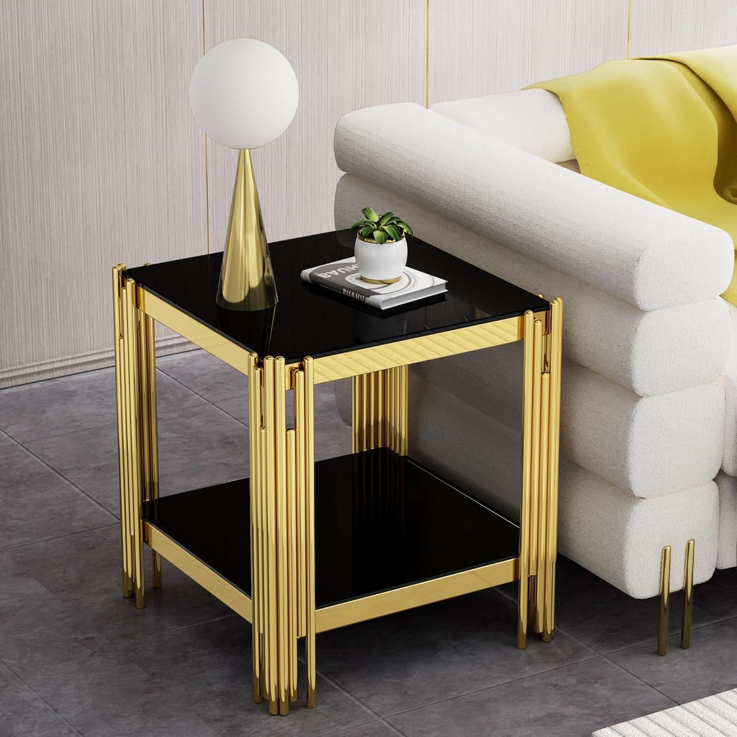 Square Glass End Table, 2-Tier Design with Black Tempered Glass & Mirrored Legs, Modern Nightstand for Living Room