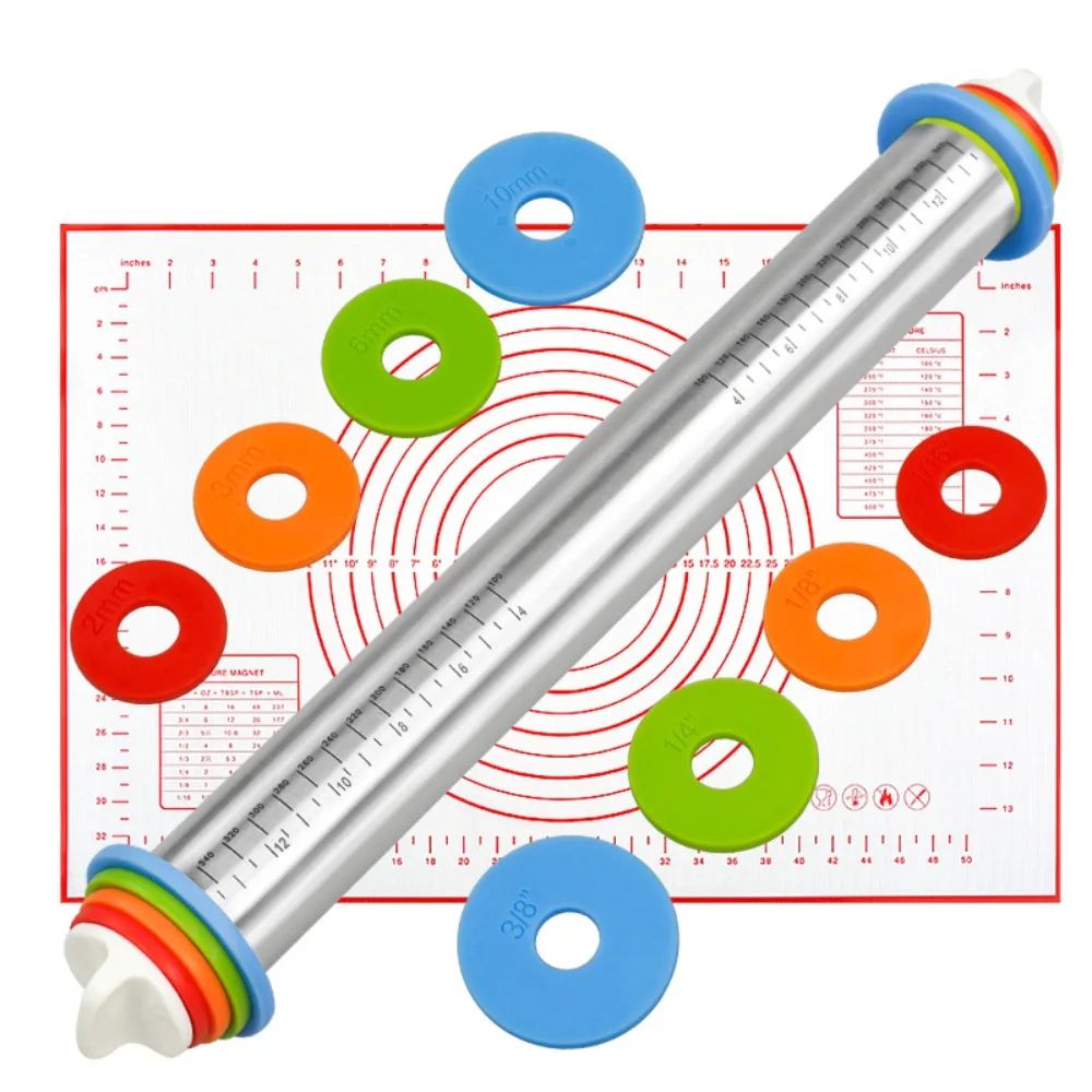Premium Stainless Steel Adjustable Rolling Pin & Silicone Baking Mat Set Precision Dough Roller For Pastries & Pizza set