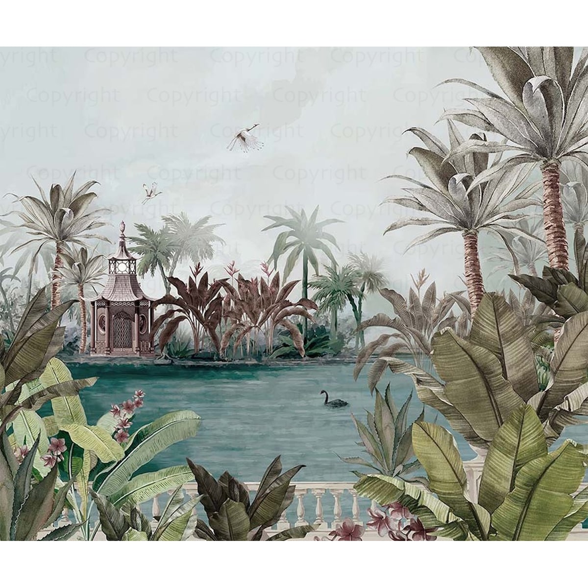 Tranquil Lakeside Pavilion Mural Tropical Palms Black Swan