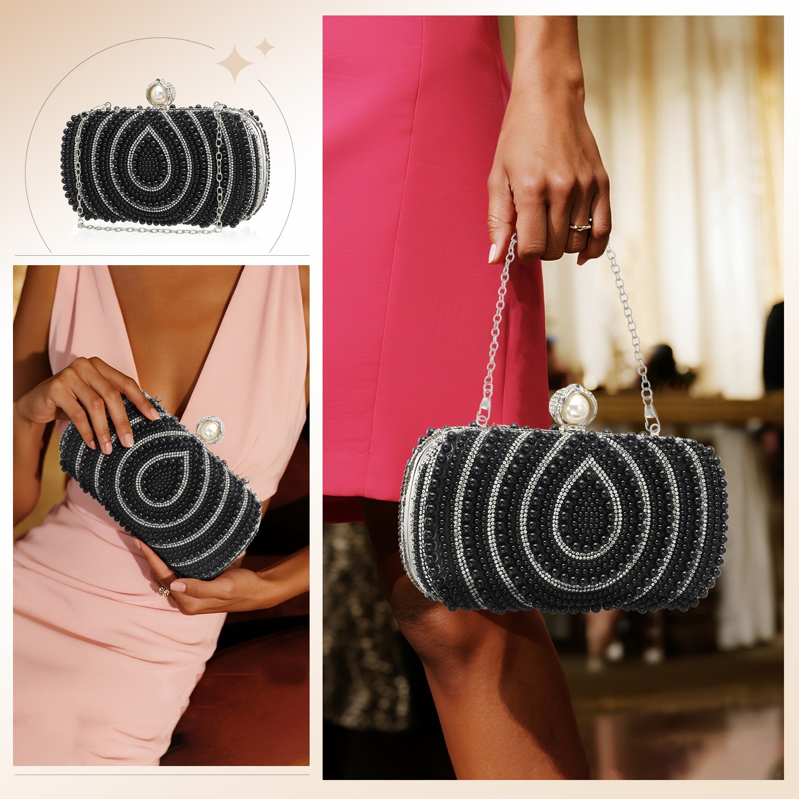 Evening Clutch Purse for Women, (Carry Handle, Chain)Vintage Beads Buckle Clasp Handbag