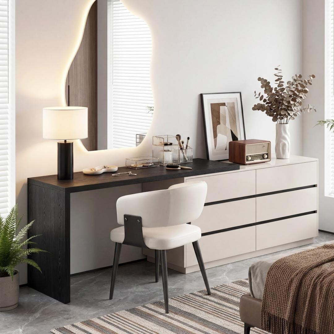 114.56" Extendable Vanity Desk Beige Black Wood 6 Drawer Modern Makeup Table